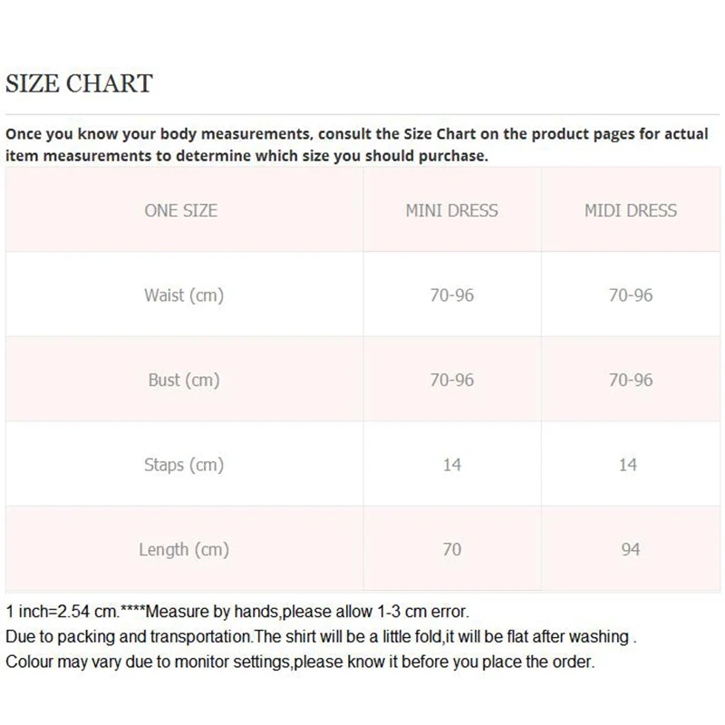 Бюст (см)70-9670-96Staps (см)1414Длина (см)70941 дюйм = 2,54 см.****Измерьте вручную,Допускается погрешность в 1-3 см.Из-за упаковки и транспортировки. Рубашка будет немного складываться,Он будет плоским после стирки.Цвет может отличаться из-за настроек монитора,Пожалуйста, имейте это в виду перед размещением заказа.