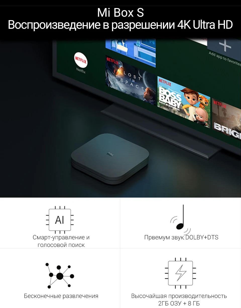 ТВ-приставка Mi Box S 4K Ultra HD Android TV 9,0 HDR, 2 + 8 Гб, Wi-Fi