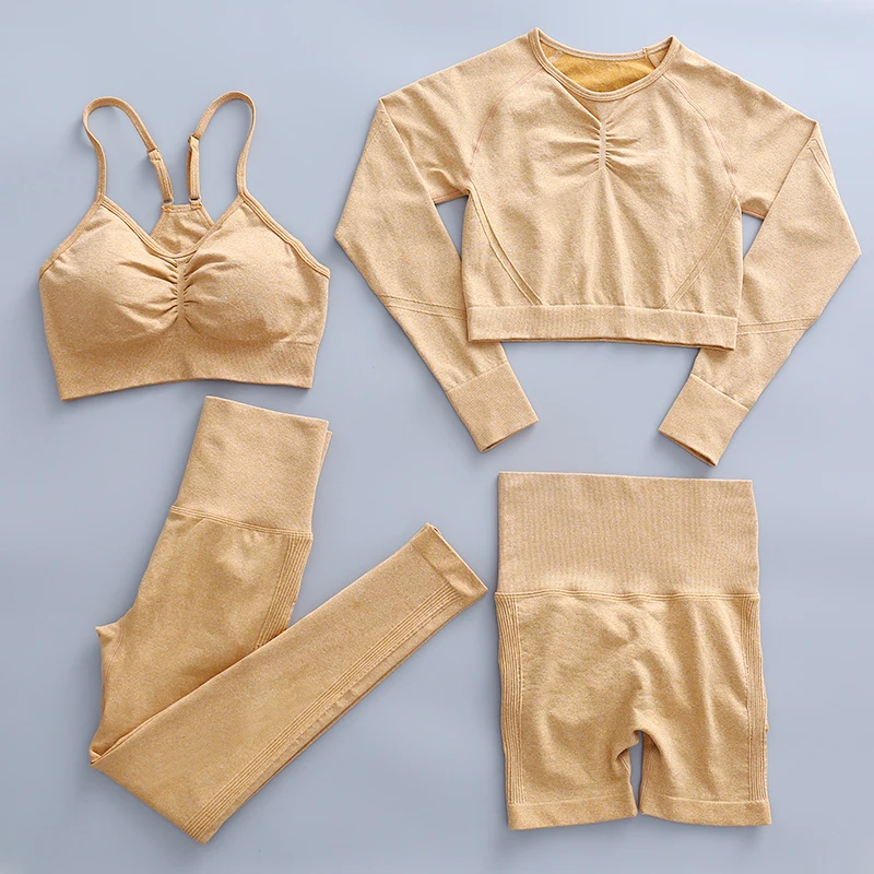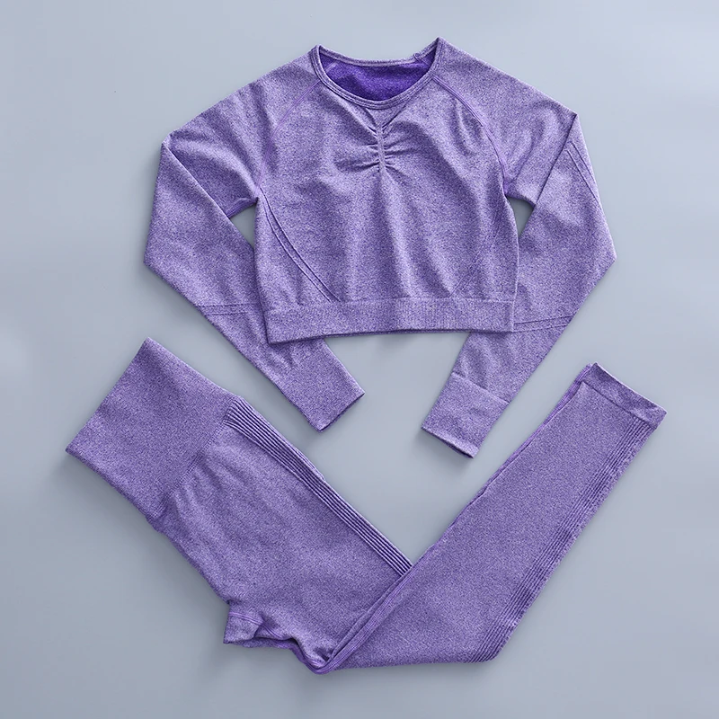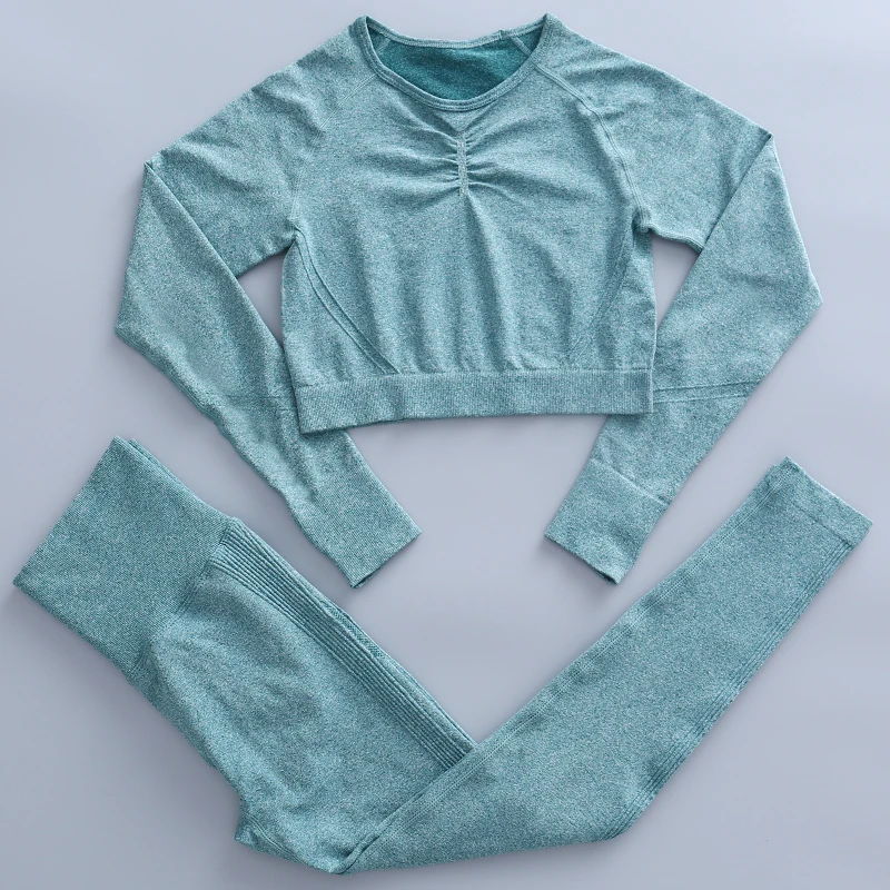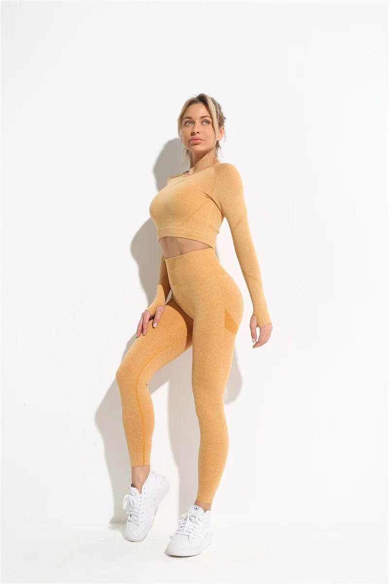 Комплект для йоги бесшовный Женский спортивный костюм из 2 предметов одежда для тренировок в тренажерном зале короткий топ с длинным рукавом и леггинсы для ягодиц одежда