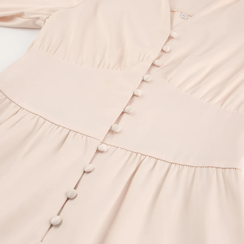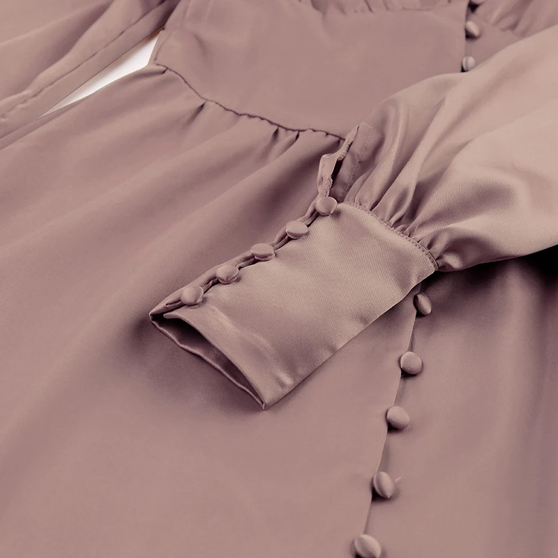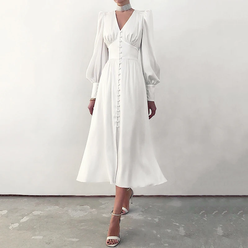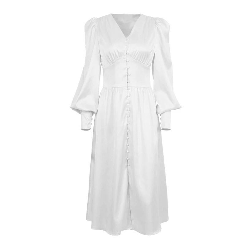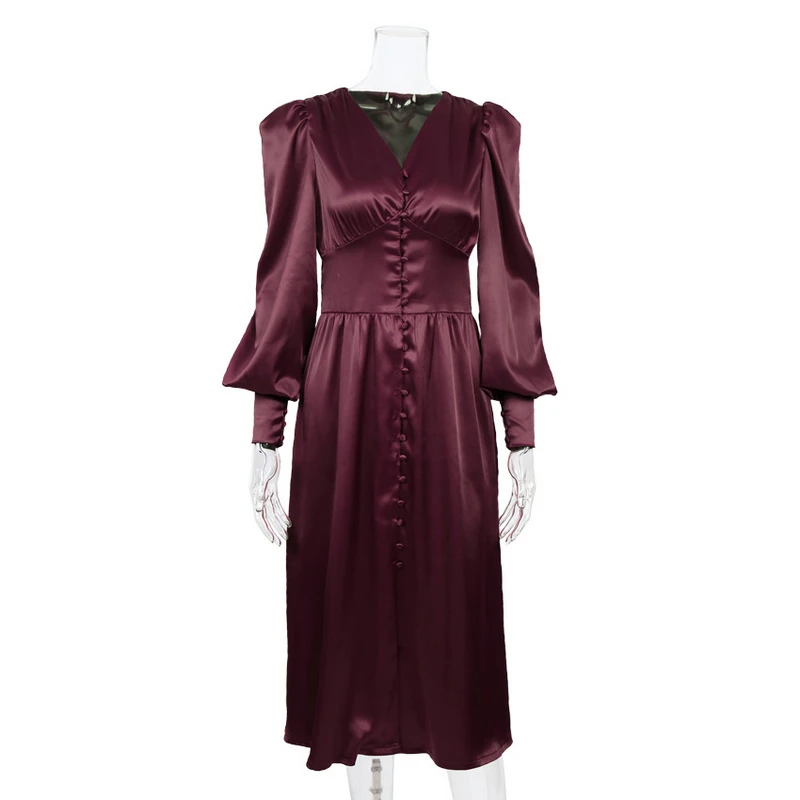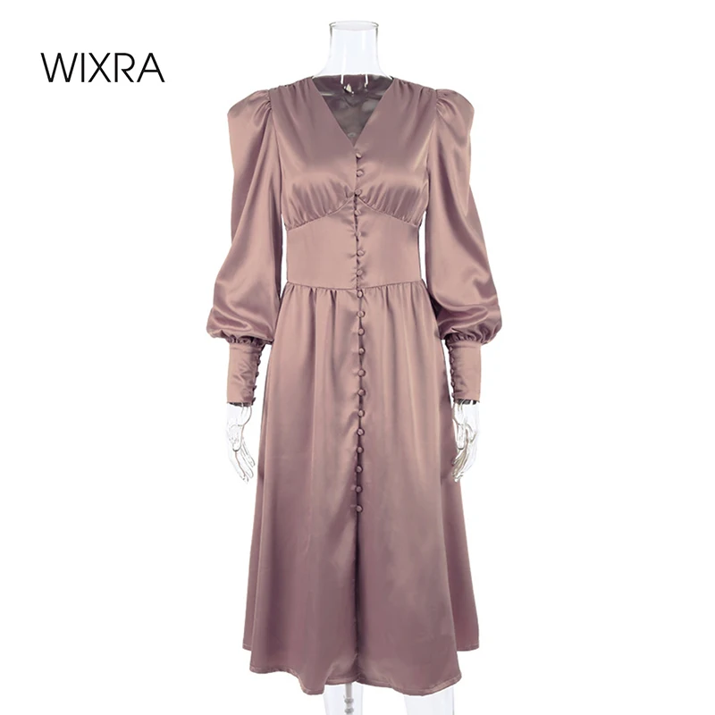 Wixra 2021 женское атласное однобортное платье с v-образным вырезом, пуговицами и длинным рукавом, разрезом, высокой талией, тонкое элегантное однотонное осеннее платье средней длины
