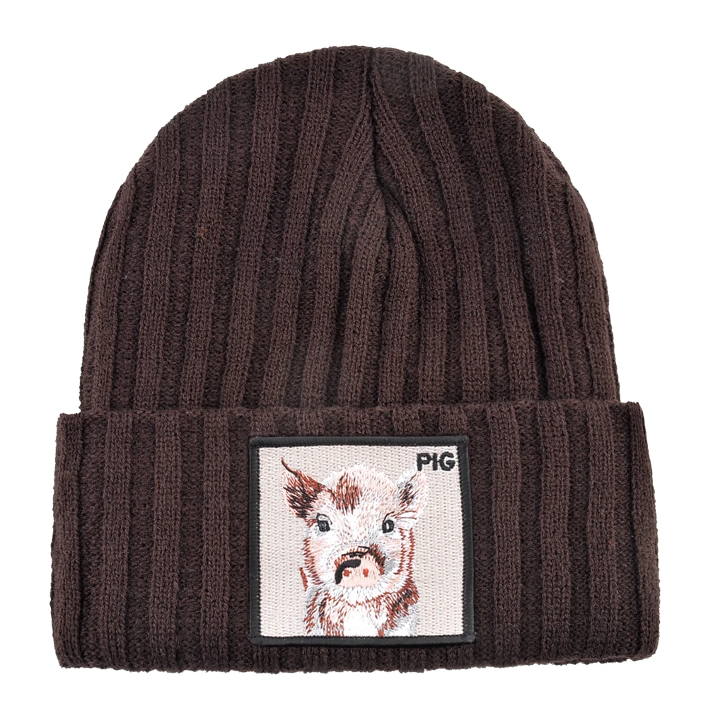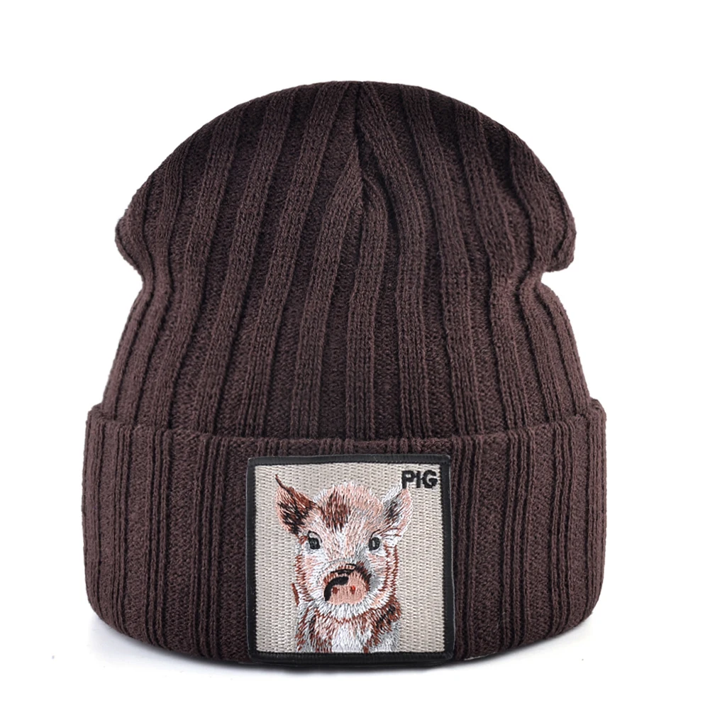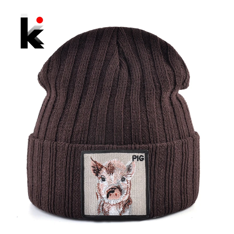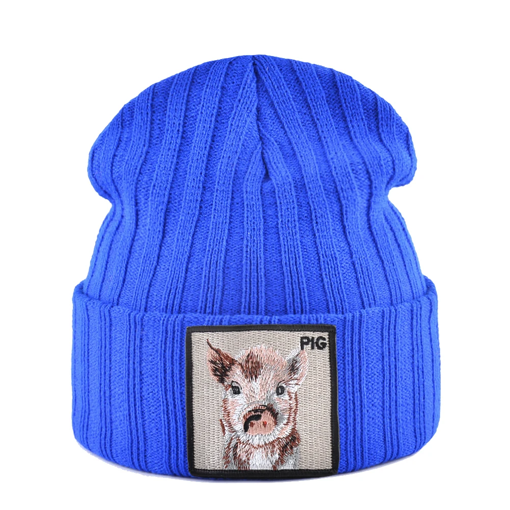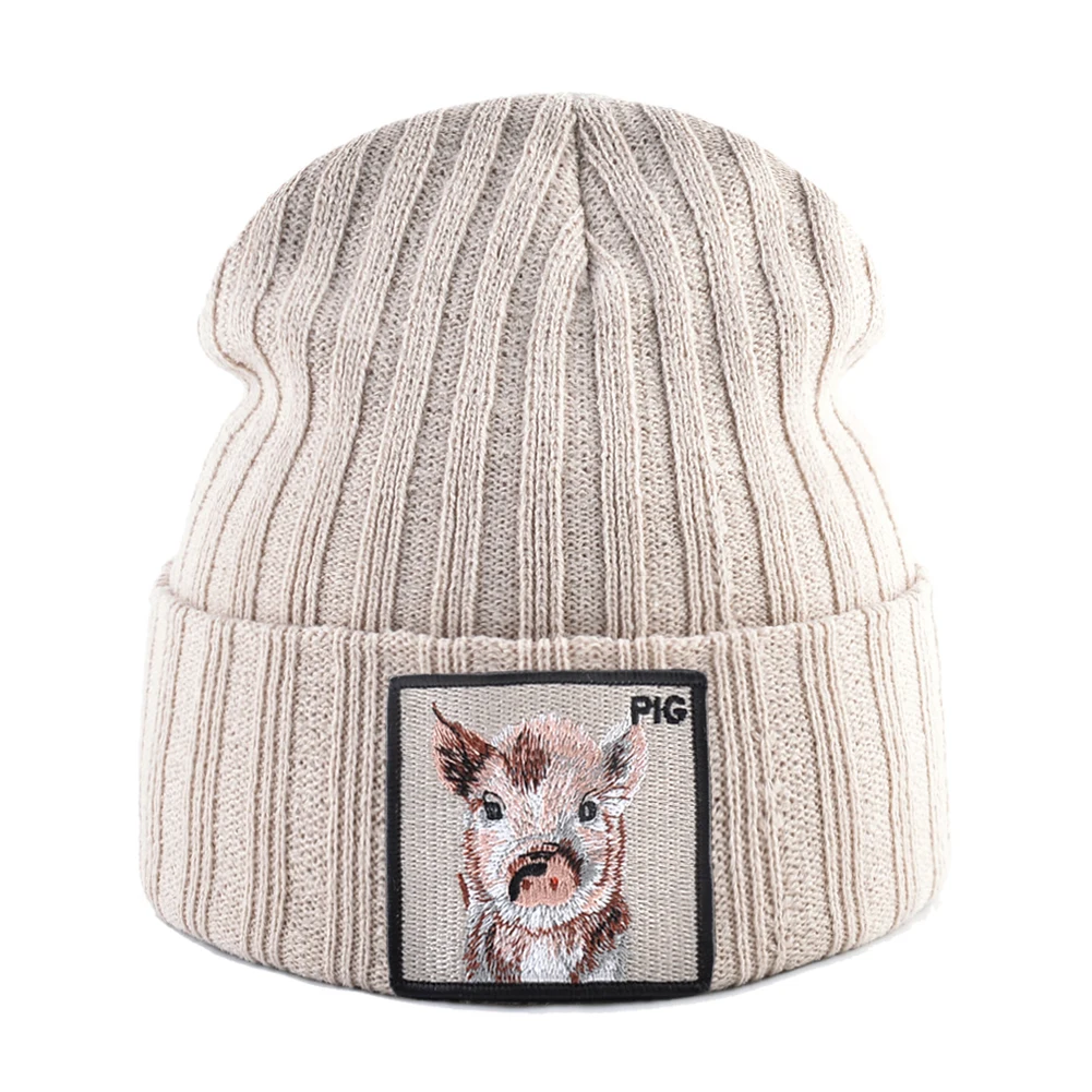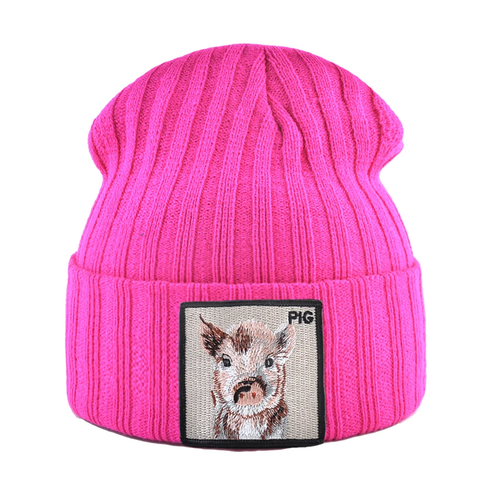 Зимняя теплая вязаная шапка с вышивкой свинки, новая мода, хип-хоп шапки бини, женская вязаная однотонная шапка бини для мужчин