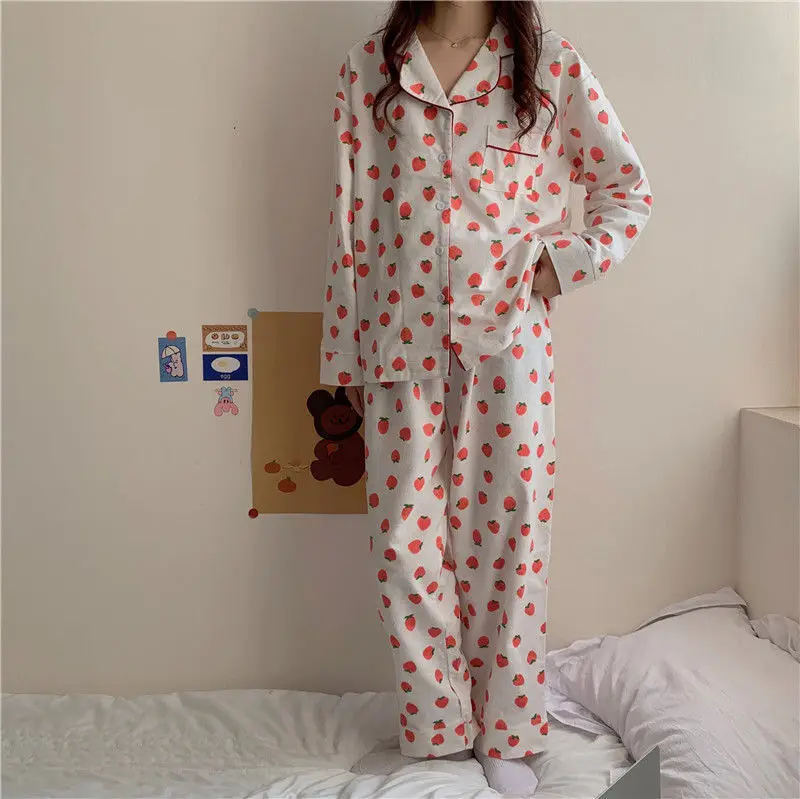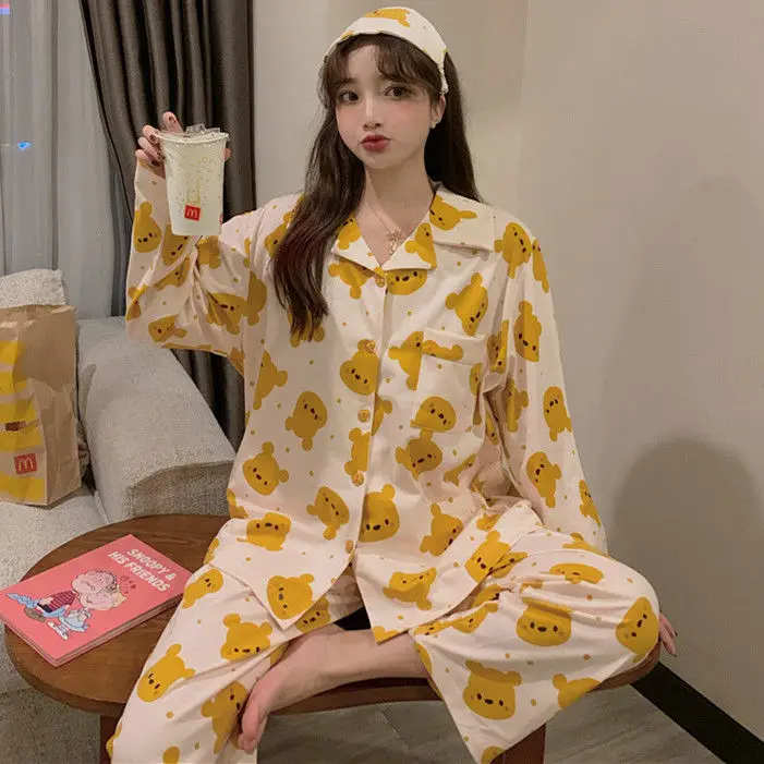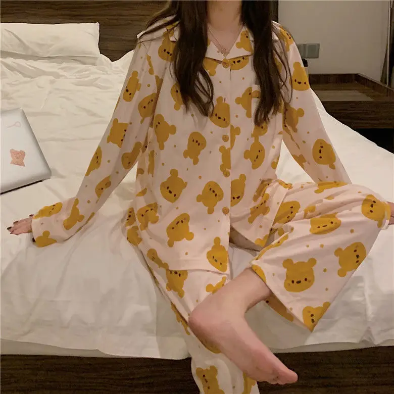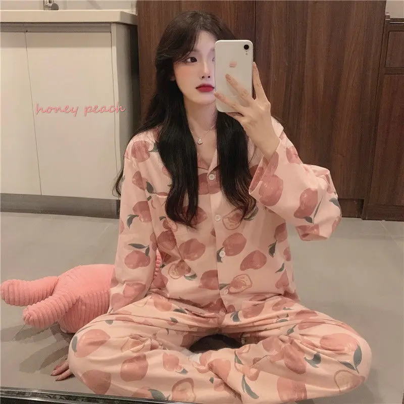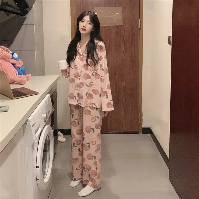 Пижама 2021i женская с длинными рукавами на весну и осень полосатая Повседневная Женская Осенняя свободная из двух частей для домашнего сервиса