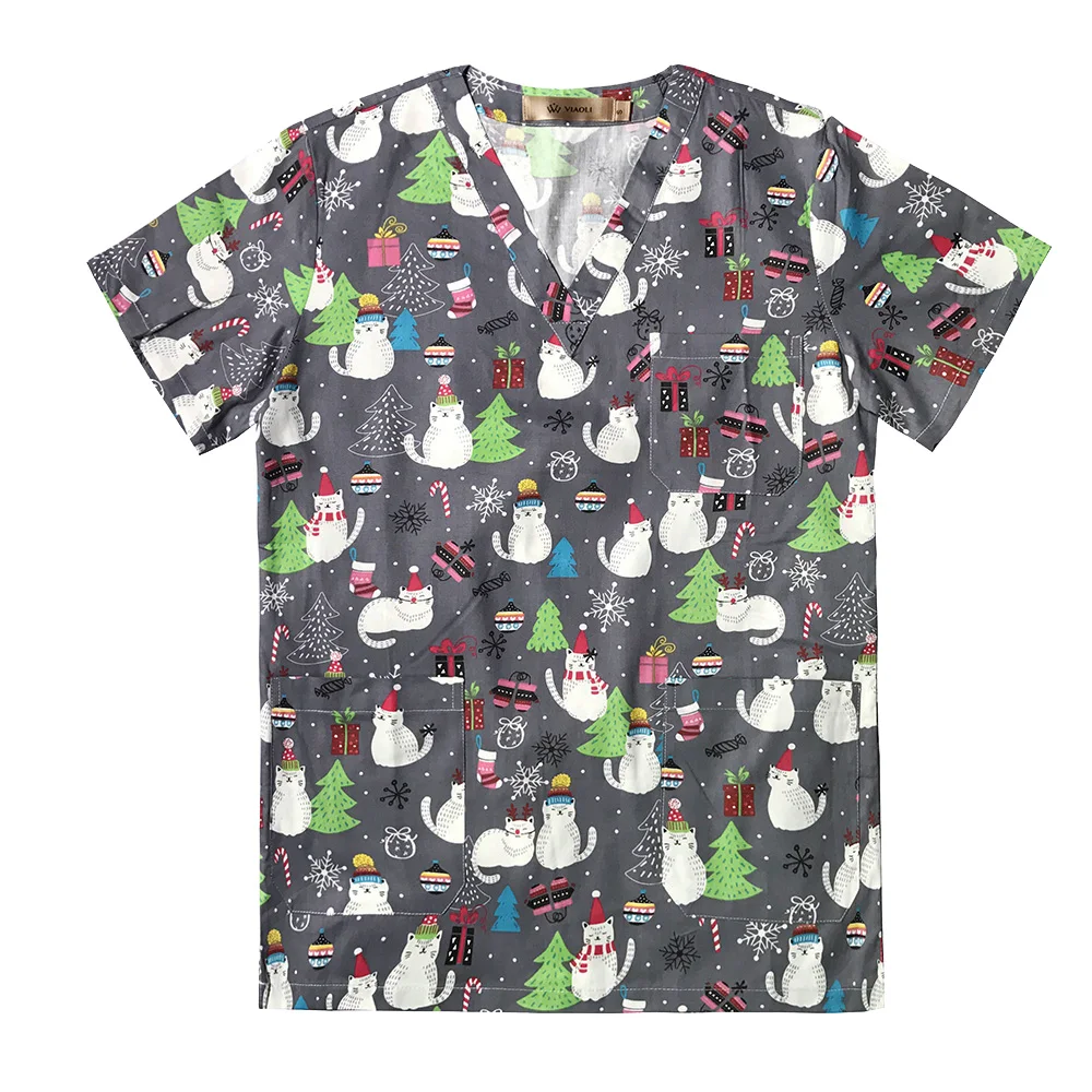 Одежда для медсестры с V-образным вырезом и карманом для доктора, топы с мультяшным рождественским принтом для медсестры, Повседневная футболка с коротким рукавом, скрабы, униформа