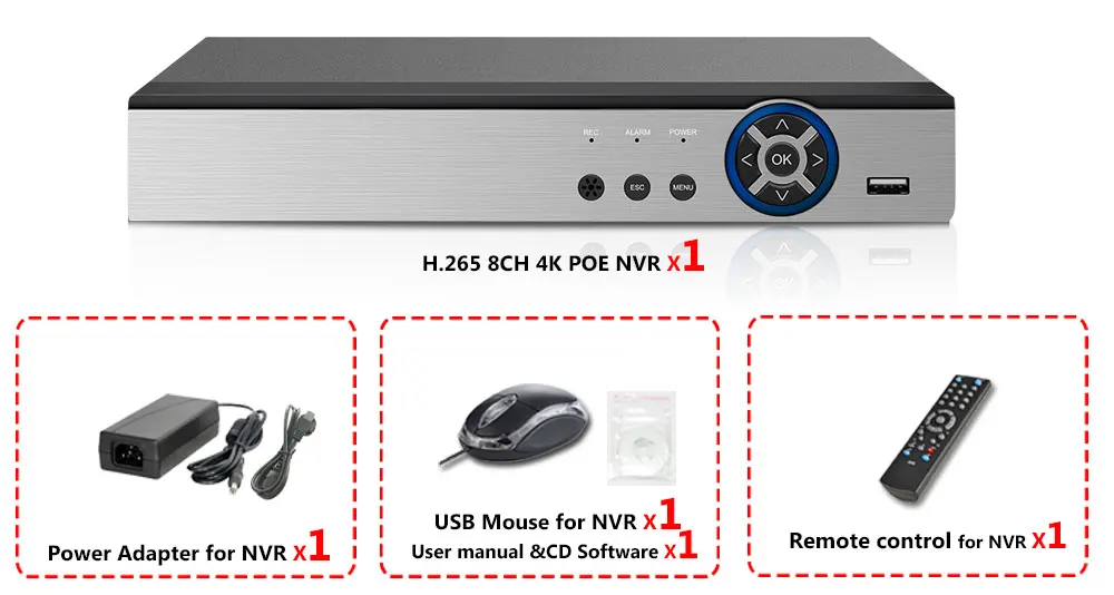 1 сетевой видеорегистратор H.265 8CH 4K POE NVR;1 x Блок питания для NVR;1 х USB мышь для NVR;1 компакт-диск программного обеспечения для NVR;1 пульт дистанционного управления для NVR;Жесткий диск в комплект не входит!