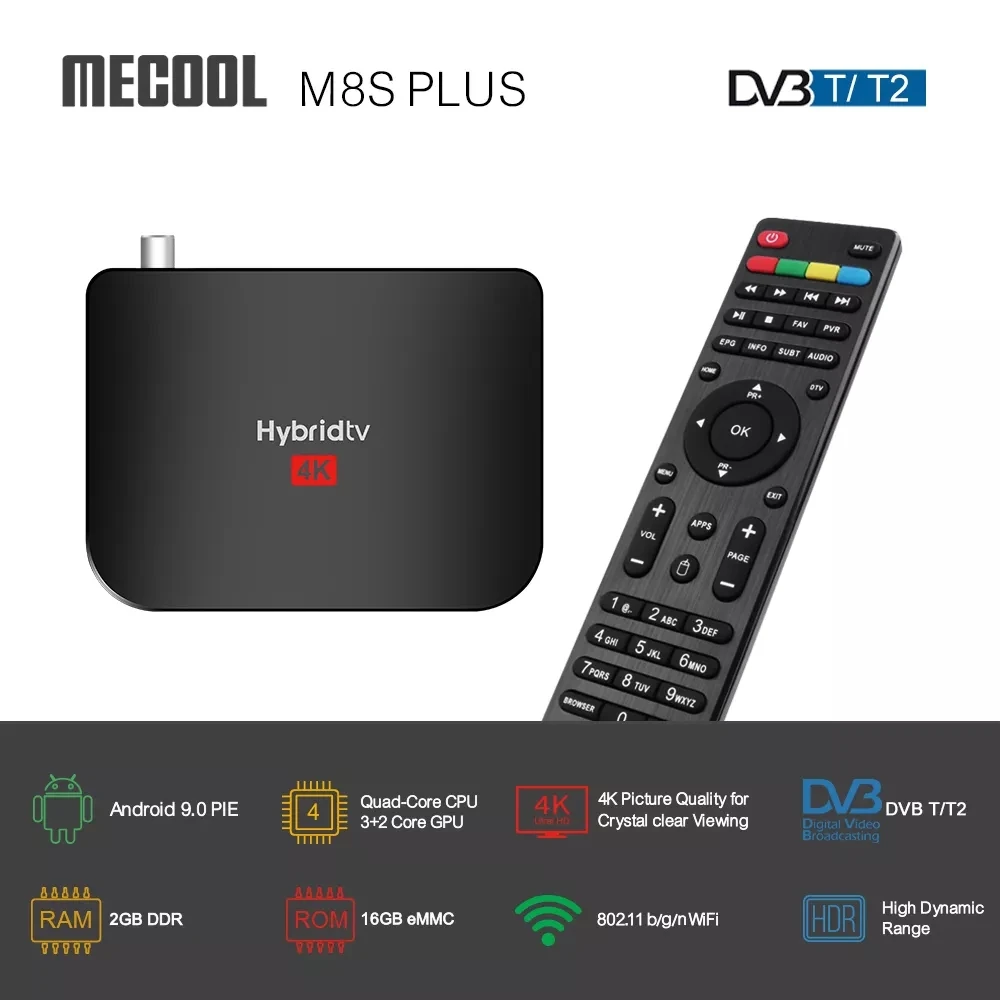 Mecool M8S PLUS T2 Hybridtv Box интегрирует Android 9,0 TV Box и DVB-T/T2 наземный приемник, который может улучшить функцию вашего телевизора или ЖК-монитора и изменить ваш традиционный телевизор или ЖК-монитор на интеллектуальную платформу, которая так же, как смартфон или планшетный ПК, подключив интернет (через WiFi или RJ45).-Android 9.0 TV Box + DVB-T/T2-DVB-T2 стандарт системы: ETSIEN 302 755-Процессор: Amlogic S905X2 Quad-Croe ARM Cortex-A53-ОС: Android 9,0-ОЗУ/ПЗУ: 2 ГБ/16 ГБ-Поддержка H.265 4K @ 60fps 10btis, VP9 профиль 2, H.264 4K @ 60fps-Поддержка 2,4 ГГц Wi-Fi 100M LAN Ethernet-Поддержка обновления OTA