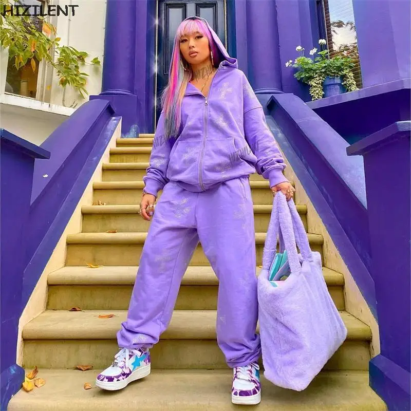 Y2K Стразы толстовки большого размера на молнии с перекрестной застежкой E-girl винтажные однотонные длинные фиолетовые женские свитшоты в стиле Харадзюку