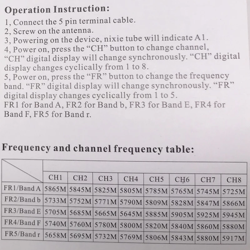40 каналов, крышка A, b, E ,F, r полосКнопка для изменения каналов и частотДвойной светодиодный дисплей для канала и частотыПамять отключения питания: воспроизведение последнего частотного диапазона и каналаОн поддерживает полный спектр 40 каналов, включая raceband 5645MHz-5945MHz.Характеристика:Этот передатчик FPV 5,8 GHz 40CH имеет двойные кнопки для легкого изменения CH и FR.40 каналов: крышка A, b, E, F, r полос. Малый размер и вес светильник.Спецификация:Формат видео: NTSC/PALВыходное сопротивление: 50 ОмЧастотный диапазон передатчика: 5645-5945 МГцДальность передачи: > 3000 м (открытая площадь)Разъем антенны: RP-SMA разъемРабочее напряжение: 7-24 ВВыходное напряжение (выход): 5 ВТок поставки: 280 мАРабочая температура: -10 + 85 CШирина видеосъемки: 0-8,0 МГцАудио Несущая частота: 6,5 МГцУровень входного видео: 0,8, 1,0, 1,2 Vp-pСопротивление входного видео: 75 ОмУровень аудиовхода: 0,5, 2,0 Vp-pСопротивление аудиовхода: 10K OhmВес: 15 г