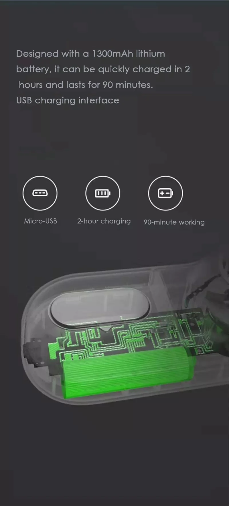 Быстрая зарядка в течение 2 часов может использоваться в течение 90 минут. Оснащен интерфейсом USB для зарядки, совместим с основным адаптером рынка, зарядным сокровищем, компьютером для зарядки.