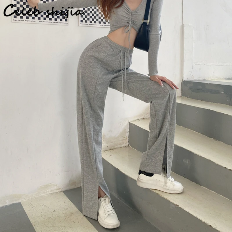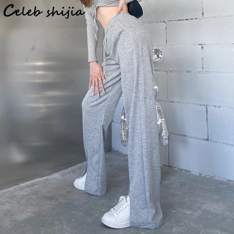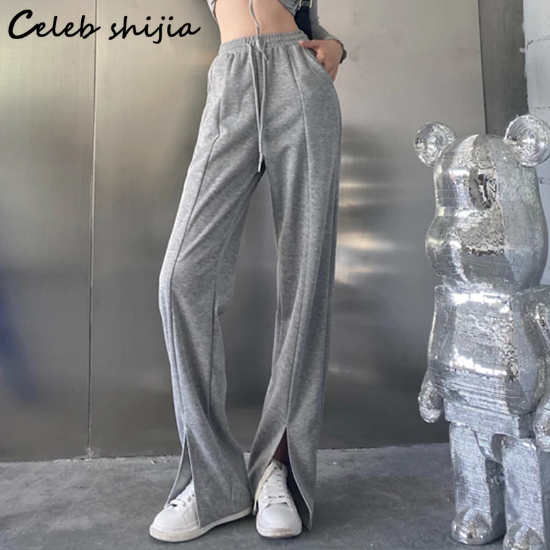 Женские брюки с завышенной талией SHIJIA, уличные штаны серого цвета с разрезом и широкими штанинами, модные брюки в пол в Корейском стиле, Y2k