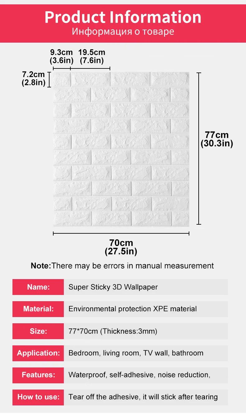 Советы по установке: Пожалуйста, убедитесь, что самолет чист перед установкой, отрежьте соответствующим образом после измерения, а затем положите его на плоскую поверхность и нажмите, чтобы сделать наклейку на стену и плоскость плотно прилегать.
