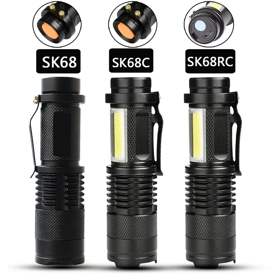 Примечание: SK68RC (встроенный аккумулятор)Цвет: черныйПереключатель: Tactic Click Reverse SwithВодонепроницаемость, можно использовать в дождливый день, но нельзя положить его в воду!Регулируемый фокус, вы можете увеличить/уменьшить масштаб, чтобы настроить его луч.