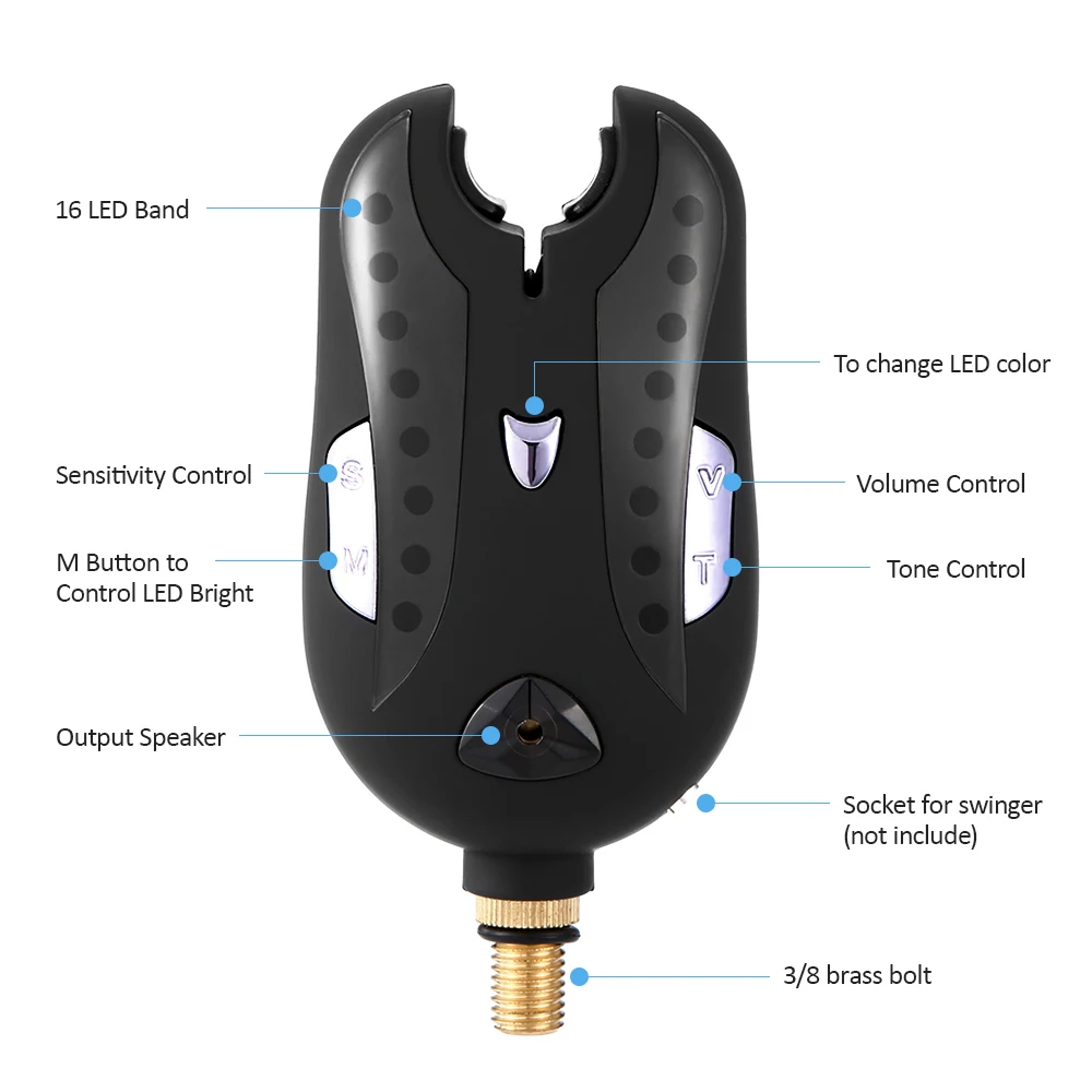 Беспроводной пульт дистанционного управления сигнализацией укуса не только имеет звуковую и световую сигнализацию во время укусов рыбы, но и отправляет сигнал на расстояние более чем 100 метров, так что вы можете идти или отдыхать с приемником, не бойтесь упустить крючок. Особенности:-ПередатчикПередатчики имеют более 100 м дальность передачи с особыми кодированными частотами.16 светодиодных ламп на каждом передатчике, для падения/возврата, настройки скорости, направления.Сигнал укуса отправит предупреждающий сигнал, когда стержень уйдет.Регулируемая чувствительность, громкость, Кнопка тона, яркий светодиод, откидывается с разным звуком.256 переменный код достаточно, чтобы предотвратить помехи от другого рыбака.Высокая видимость LED фиксация около 20 секунд, LED тревожные сигналы с высоким выходным динамиком.Фиксированный болт с регулируемым винтом и дополнительной вилкой для подсвечиваемого свингера.Питание от аккумулятора 9 В (не входит в комплект). -ПриемникПередатчики имеют более 100 м дальность передачи.6 различных цветов светодиодных ламп для соответствия 6 различных сигналов тревоги.Вкл/Выкл, регулировка громкости, кнопка вибрации.Вибрация, светодиодные тревожные сигналы с высоким выходным динамиком.Светодиод с памятью, ночник, питание от 3 * AAA 1,5 В батареи (не входят в комплект).Портативный чехол на молнии с подкладкой хранит все содержимое, удобно носить с собой. Технические характеристики:Материал: АБС и медьТип: JY-17-6 (опционально)Размер сигнализации при укусе: 11,5*5*4 см/4,5*1,9*1,5 дюймаРазмер приемника: 11*5,5*3 см/4,3*2,1*1,1 дюймаРазмер чехла на молнии: 30*20*5 см/11*7 * 1.9inРазмер упаковки: 34*23*6 см/13,6*9,6 * 2.3inВес упаковки: 900 г В комплект входит:6 * Сигнализация для рыбалки1 * приемник1 * Руководство пользователя (на английском языке)1 * чехол