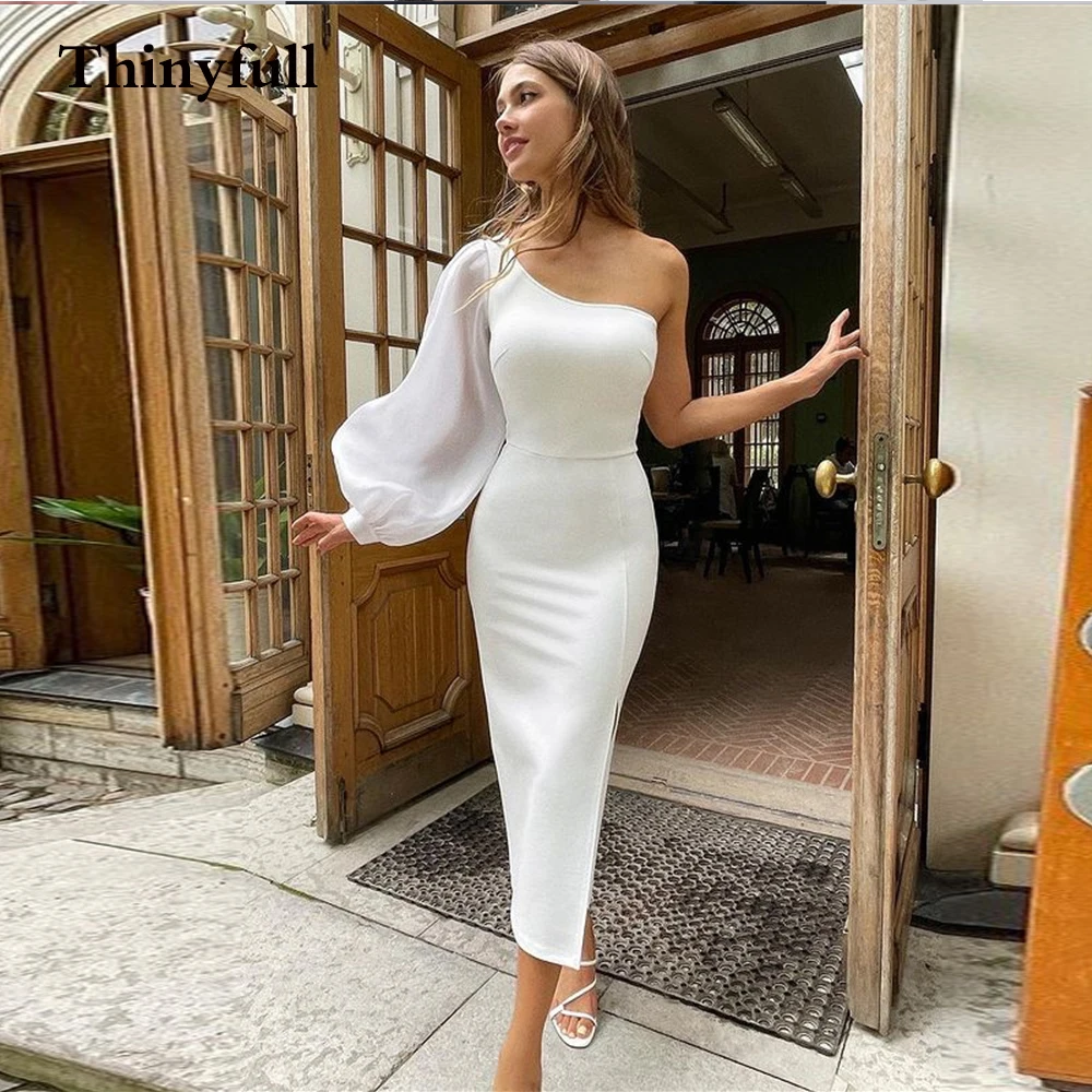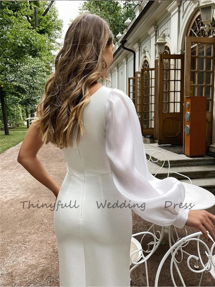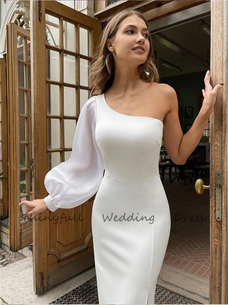 Простое короткое мягкое атласное свадебное платье А-силуэта на одно плечо Свадебные платья Мини длиной ниже колена с длинными рукавами Свадебные платья невесты