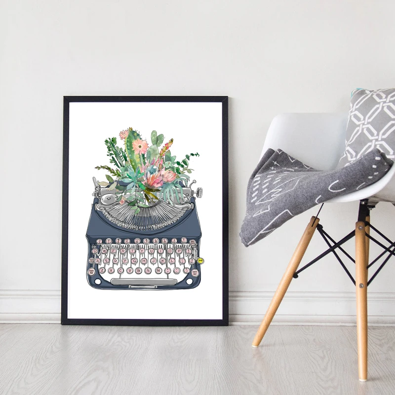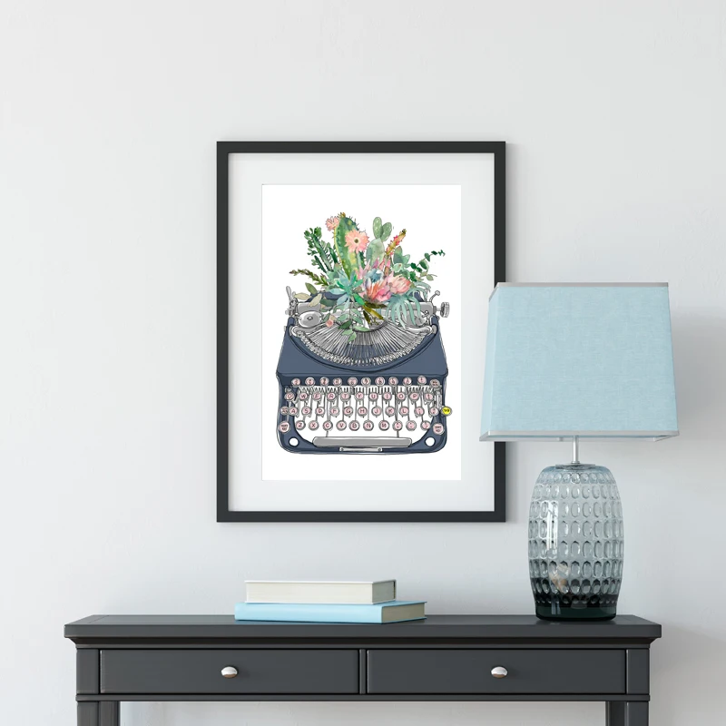Пишущая машинка, акварельный кактус, украшение для спальни, настенное искусство, холст, картина, печать, Подарочные постеры, винтажные картины, домашний декор