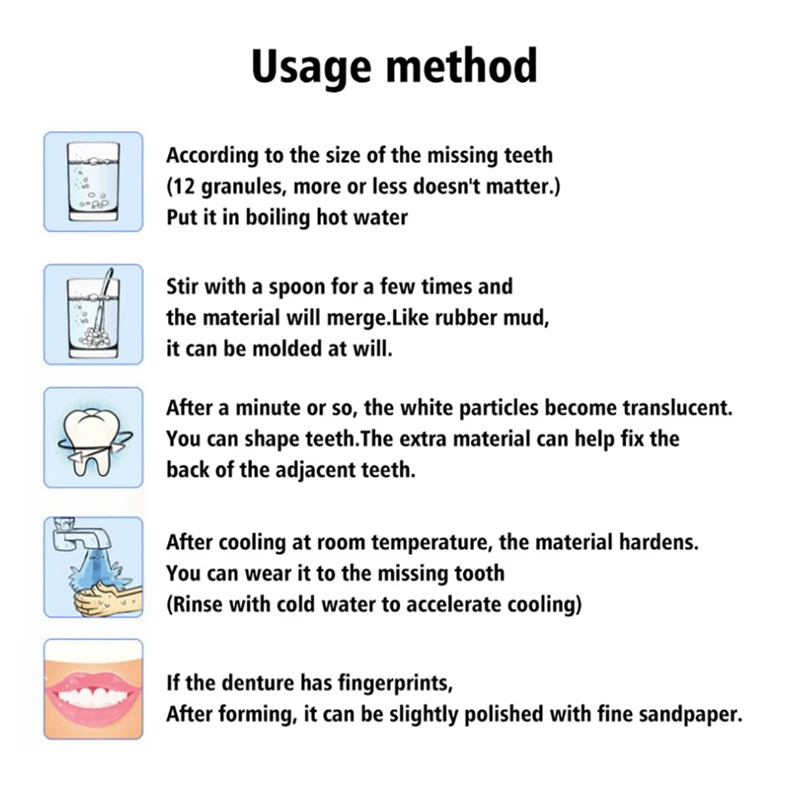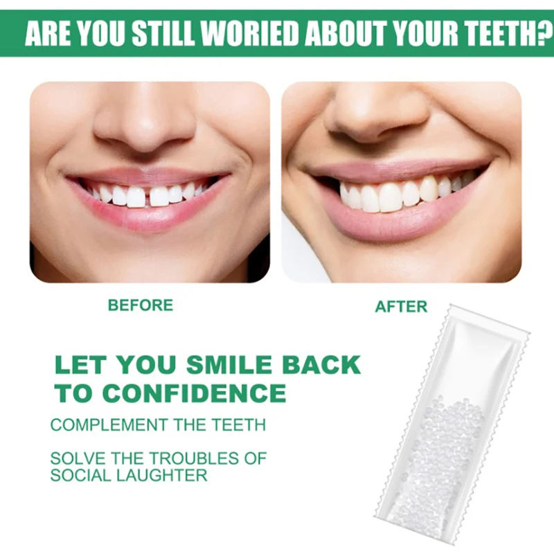 Характеристика:1. Временный набор для ремонта зубов-для заполнения отсутствующих, зазоров или сломанных зубов. Отлично подходит для мгновенного и временного использования, а также для улыбки, сделает ваши зубы естественными и красивыми.2. Многофункциональный в использовании-продукт также может быть использован d в косплей, Diy, пользовательские ручки, ручки и ручки, изготовление моделей, прототипирование и так далее, как вам нравится. Вы можете найти это довольно полезный продукт.3. Удобный-изготовлен из высококачественного и полностью безопасного материала. Вы можете использовать его, и его форма/размер могут быть настроены так же, как вы хотите, просто поставив в кипящую воду в течение нескольких минут. Это довольно легко сделать с заменой зубов.4. Легкий термо-пластик, который действует как глина, когда он теплый, но когда он охлаждается, это твердый пластик.5. Добавьте горячую воду 60 градусов Цельсия и выньте ее, когда она прозрачная. Вы можете добавить жирные пигменты и разминать их после окрашивания. Положить холодную воду после разминания может ускорить формирование.