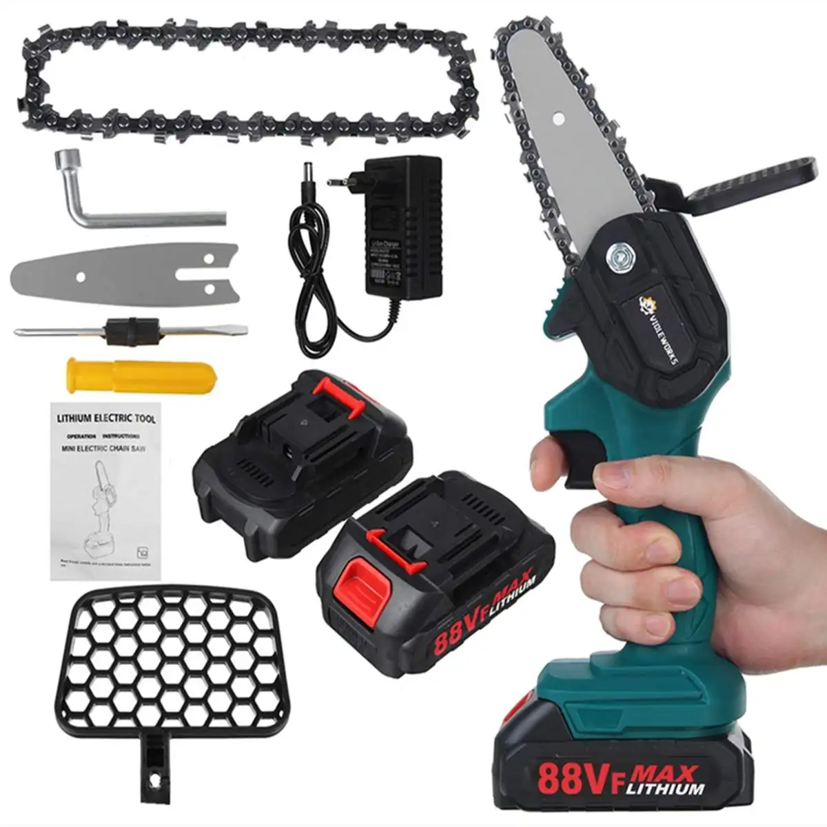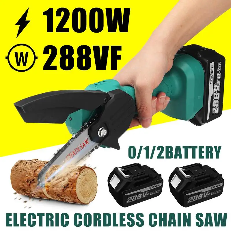 Характеристики:Материал: АБС + металлЦвет: зеленыйБатарея: литиевая батарея, 88VF 2500mAh /288VF, 22980mAh (входит в комплект)Мощность: 800 Вт/1200 ВтДлина направляющей пластины: 4 дюймаСкорость цепи: 5 м/сРазмер резки: <100 ммВремя работы: один Батарея для 1,5 часовОпционально шаблон: 1 комплект батарей/2 комплекта батарей