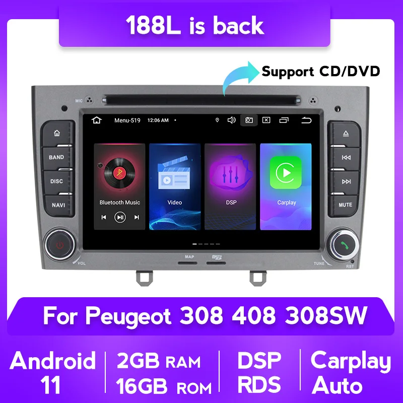 Автомагнитола на Android 11 DSP RDS с DVD-плеером для Peugeot 308 408 308SW мультимедийная Навигация стерео головное устройство встроенный Carplay + авто