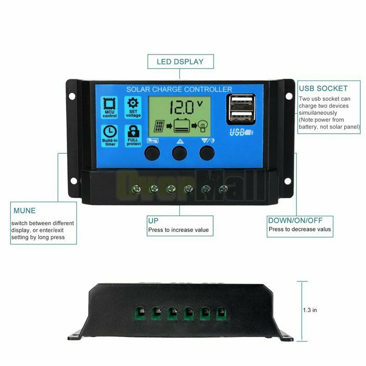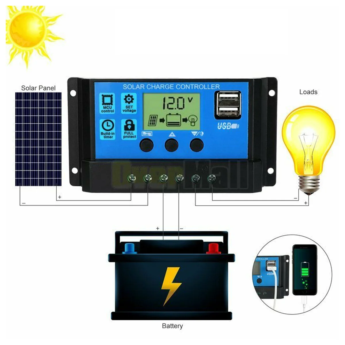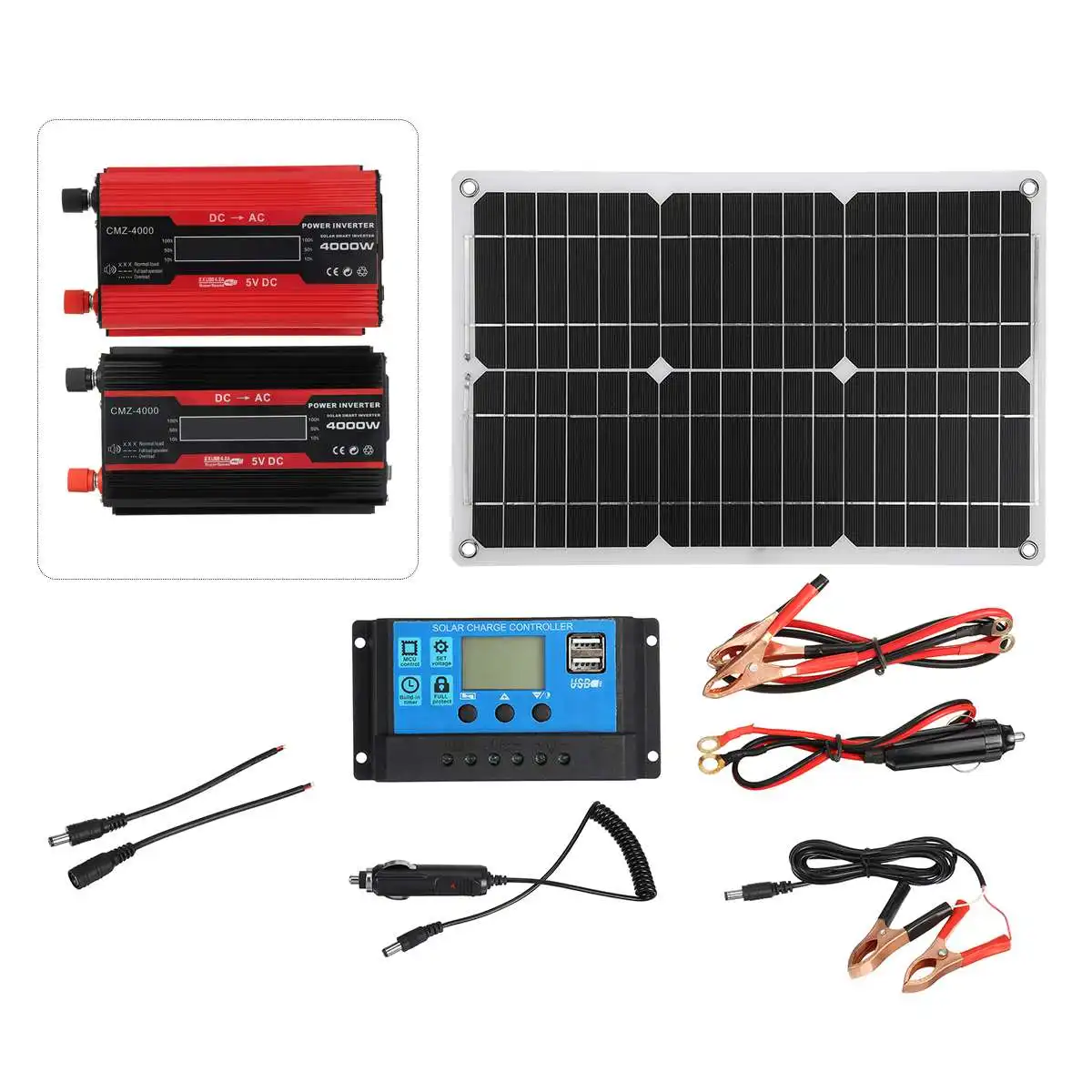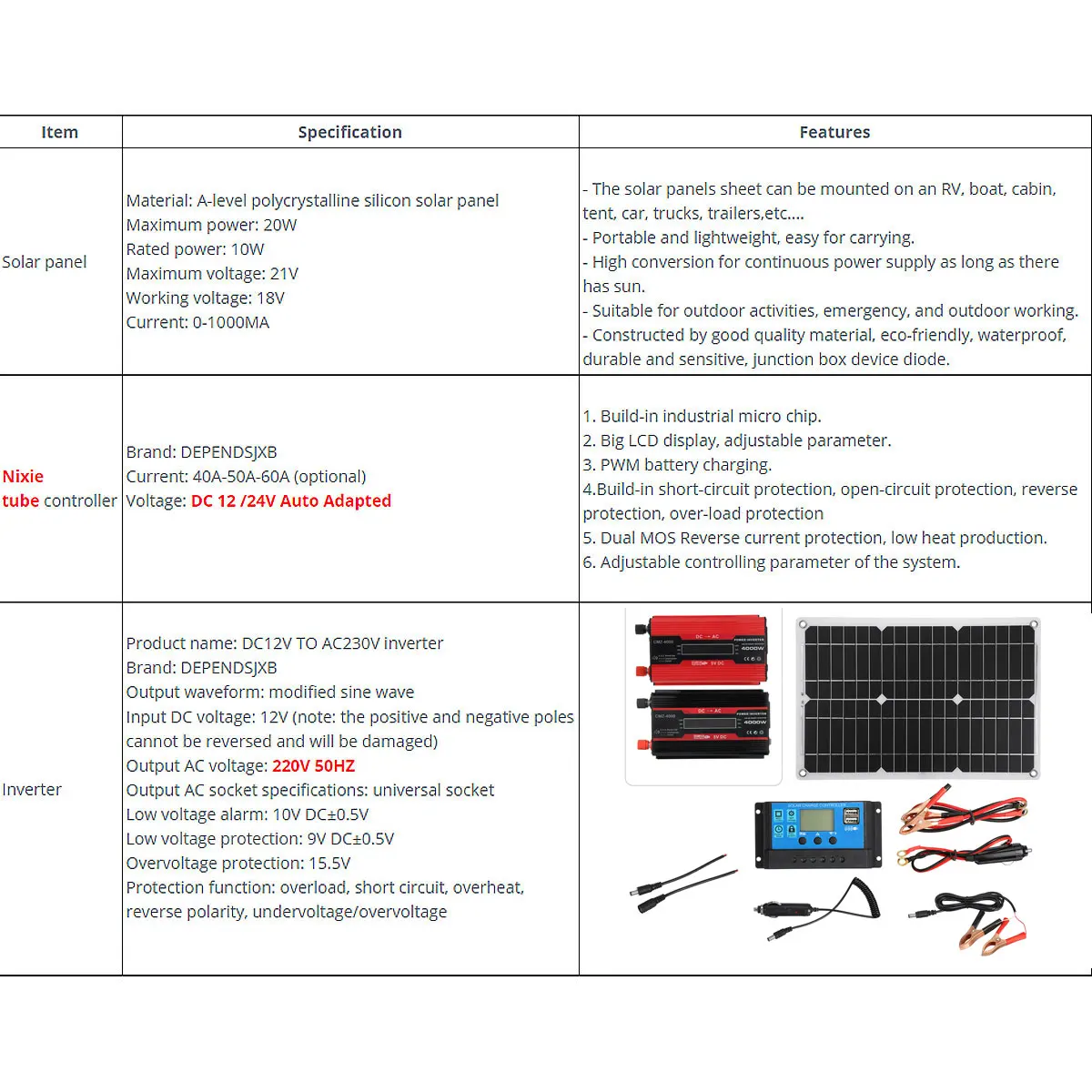 Особенности:1. Генерация энергии RV, система генерации кислорода в аквариуме, бытовая система солнечной энергии переменного тока.2. Экологически чистый и не загрязняющий окружающую среду, он реализует Преобразование энергии от солнечной энергии к электрической энергии3. Широкий спектр применений, его можно использовать во многих местах, таких как для автомобилей, небольших бытовых приборов и т. Д.4. Солнечная панель-это устройство, которое прямо или косвенно преобразует солнечное излучение в электрическую энергию, поглощая солнечный свет. По сравнению с обычными батареями и перезаряжаемыми батареями, солнечные панели более энергосберегающие и экологически чистые.Характеристики:Материал панели солнечных батарей: А-уровень поликристаллического кремния солнечная панельСкорость обнаружения: IP65Размер панели: 420*280 мм/16,9*11,26 дюймовМаксимальная мощность: 20 ВтНоминальная мощность: 10 ВтМаксимальное напряжение: 21 вРабочее напряжение: 18 вТок: 0-1000 мА-Лист солнечных панелей может быть установлен на колесах, лодках, каютах, палатках, автомобилях, грузовиках, прицепах и т. д.-Портативный и легкий, удобный для переноски.-Высокая Конвертация для непрерывного источника питания до тех пор, пока есть солнце.-Подходит для активного отдыха, аварийной и наружной работы.-Изготовлен из высококачественного материала, экологически чистый, водонепроницаемый, прочный и чувствительный, устройство распределительной коробки диода.Регулятор трубки NixieТок: 40A/50A/60AНапряжение: 12 /24 В постоянного тока автоматически адаптирован1. Встроенный промышленный микрочип.2. Большой ЖК-дисплей, регулируемый параметр.3. Зарядка аккумулятора PWM.4. Встроенная защита от короткого замыкания, защита от открытого замыкания, защита от обратного хода, защита от перегрузки5. Двойной МОП-защита от обратного тока, низкое производство тепла.6. Регулируемый Контрольный параметр системы.ИнверторНазвание продукта: инвертор от DC12V до AC230VФорма выходного сигнала: модифицированная Синусоидальная волнаВыходная мощность: 4000 ВтВходное напряжение постоянного тока: 12 В (Примечание: положительные и отрицательные полюсы не могут быть изменены и будут повреждены)Выходное напряжение переменного тока: 220 В 50 ГцХарактеристики выходного гнезда переменного тока: Универсальная РозеткаОповещение о низком напряжении: 10V постоянного тока ± 0,5 VЗащита от низкого напряжения: 9 В переменного тока ± 0,5 VЗащита от перенапряжения: 15,5 VФункция защиты: перегрузка, короткое замыкание, перегрев, обратная полярность, пониженное напряжение/перенапряжениеПосылка включена (батарея не включена):1 * солнечная панель1 * контроллер1 * инвертор2 * Соединительный кабель1 * руководство на английском языке