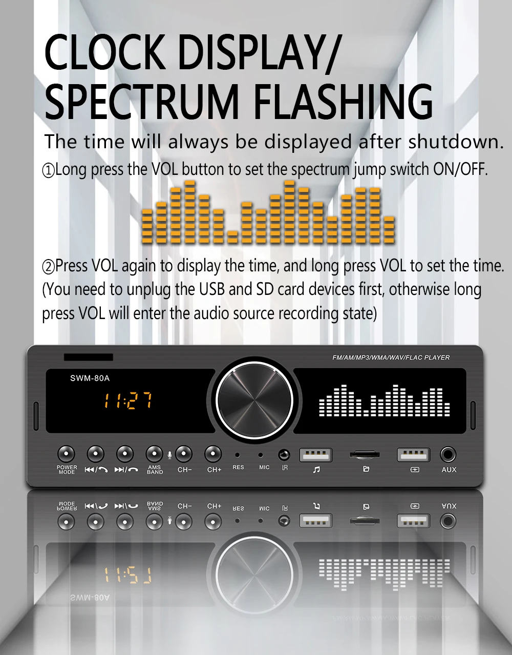 7. Функция копирования аудио, поддержка записи источника звука, вы можете Непосредственно копировать радио-и AUX музыку и Bluetooth на U-диск.