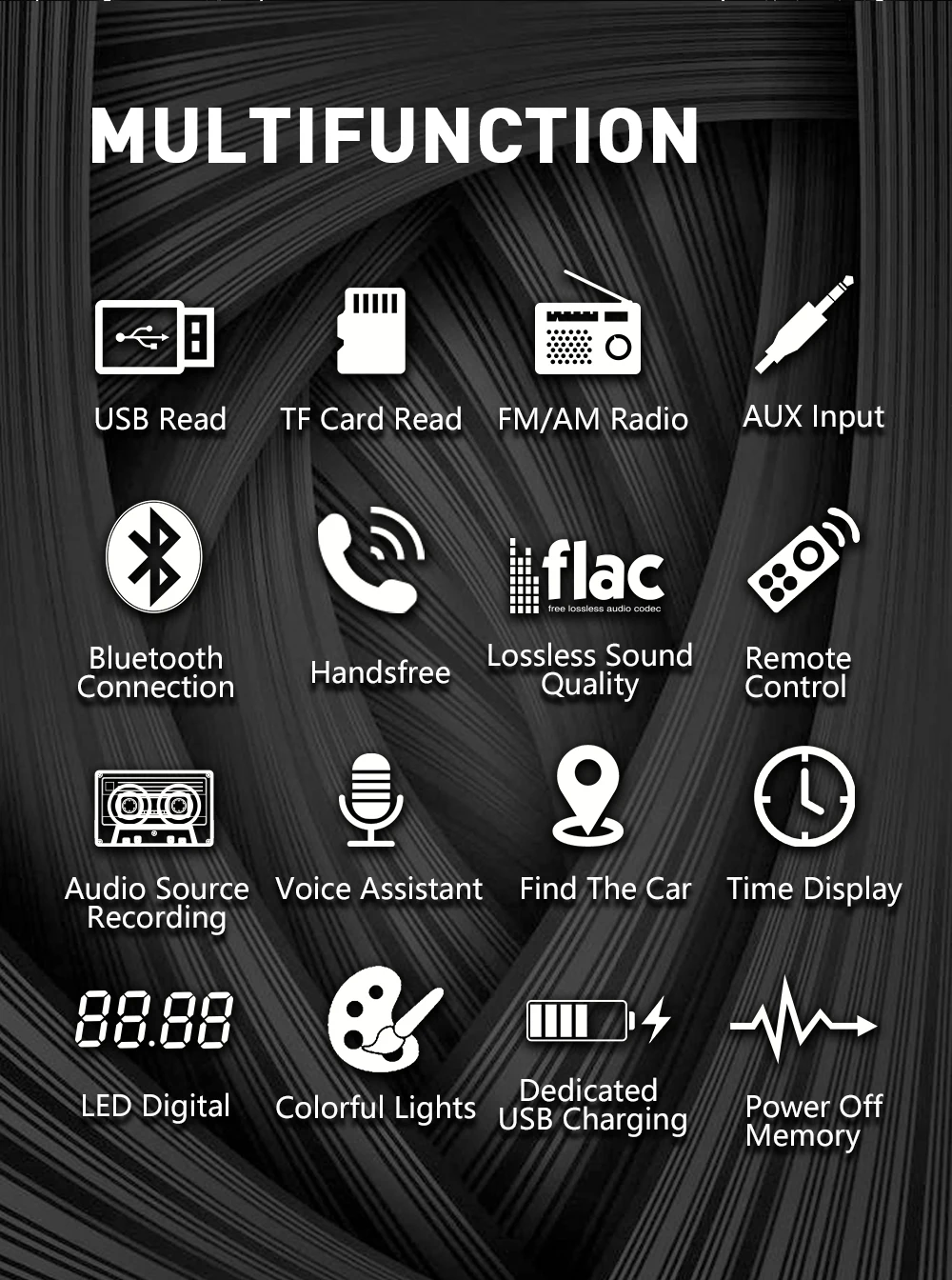 Специальная функция: FM /AM радио, Bluetooth, Hands-free Звонки, mp3-плеер, AUX, двойная USB зарядка,