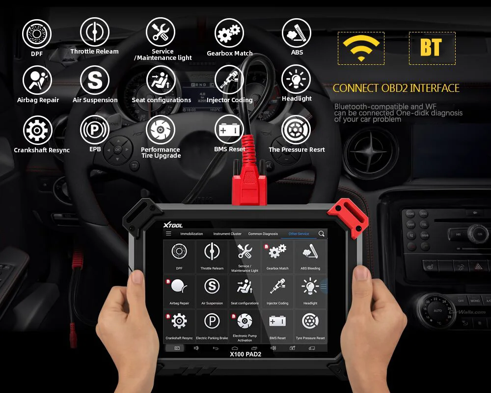 X100 PAD2-это первый планшетный ключевой программист в мире! Он не только предоставляет клиентам профессиональные ключевые программирование, но и наиболее необходимые специальные функции для мастерской. X100 PAD2 является планшетной ветвью с новейшими технологиями для выполнения ключевой программирующий, сброс давления светильник сбросить сброс давления, светильник сброс, давление в шинах Предупреждение светильник сброс, EPB, сброс тела дроссельной заслонки, сброс DPF, сброс батареи, Калибровка угла рулевого управления и OBD-II диагностику двигателя.