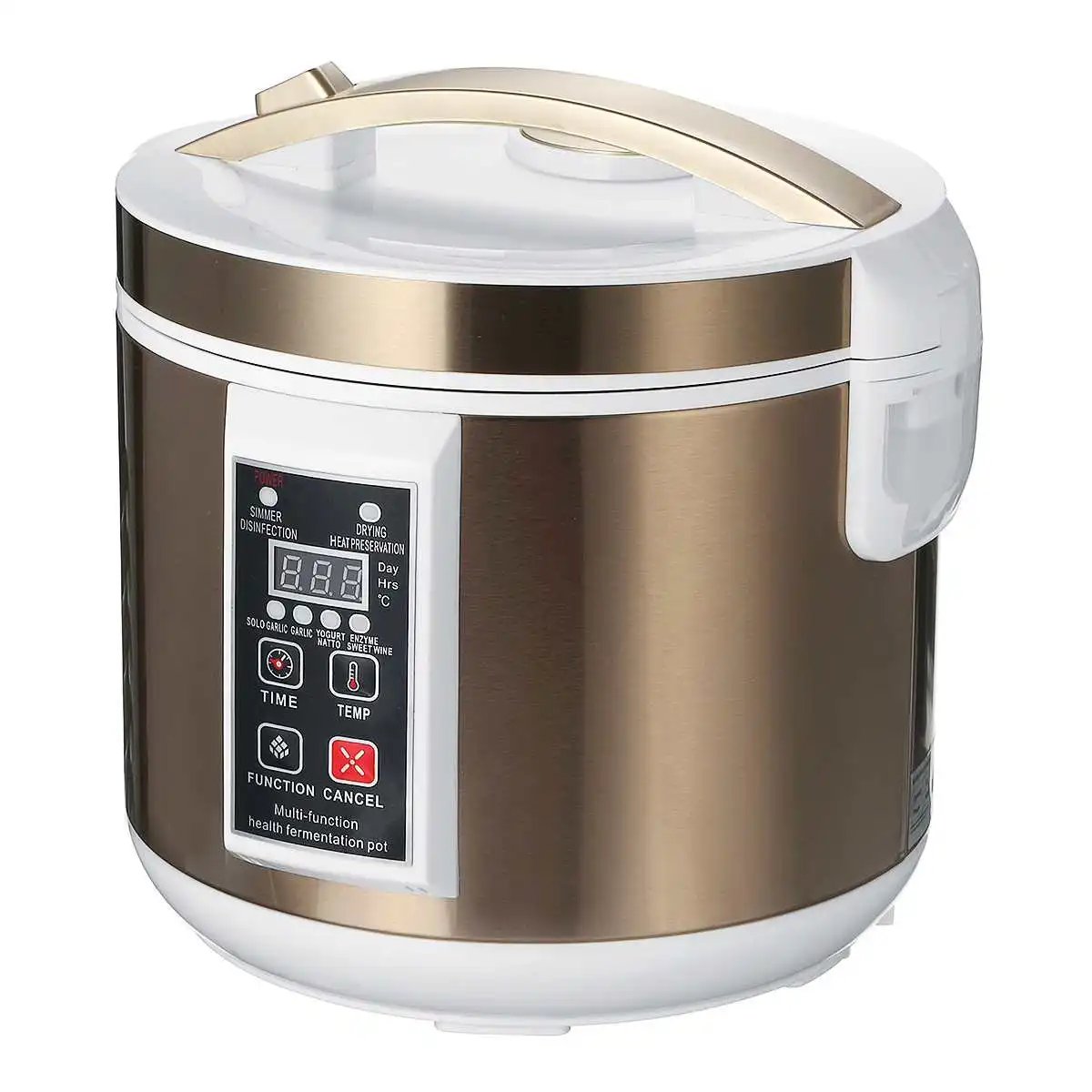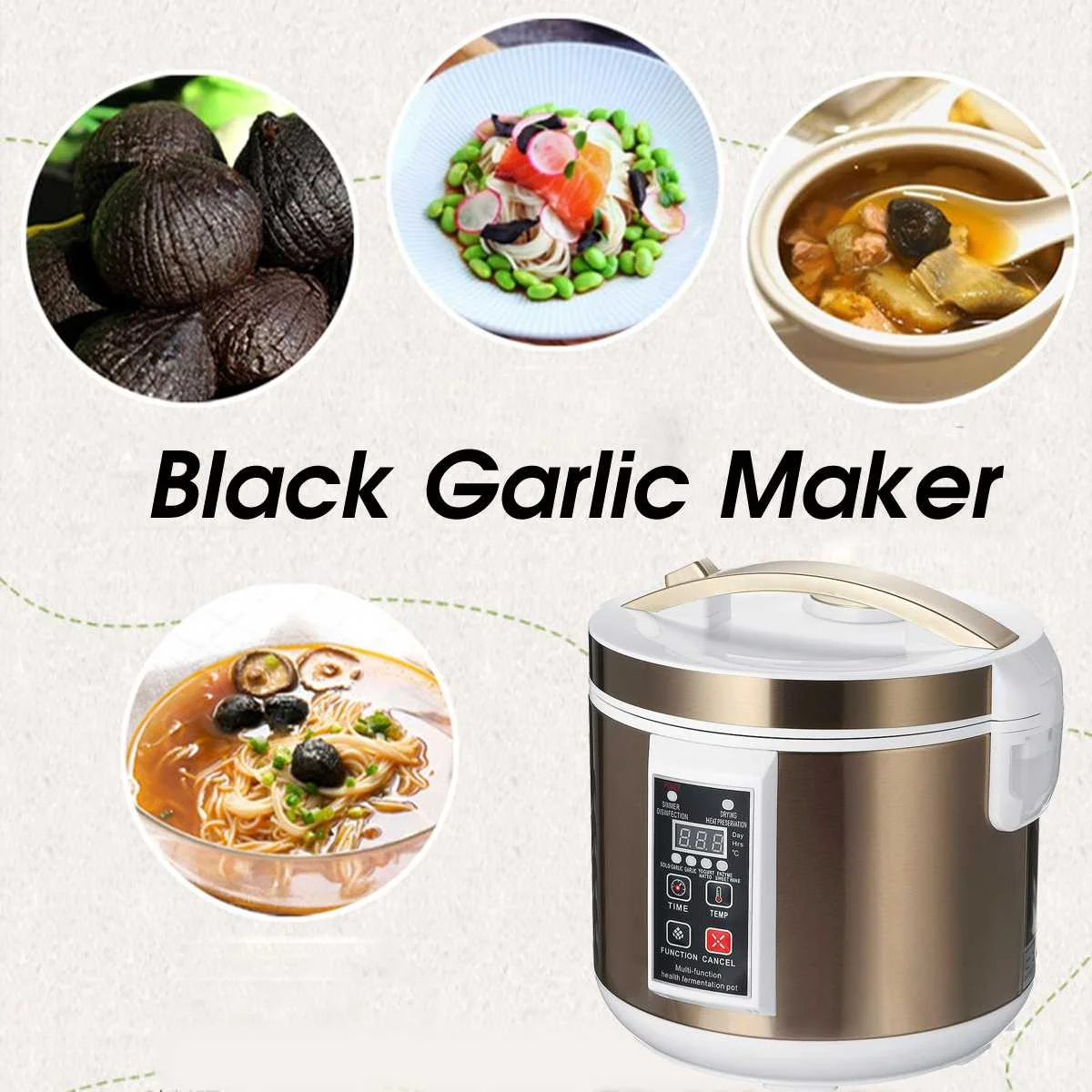 Посылка включает:1 х черный ферментер чеснока1 x внутренний горшокНержавеющий держатель-1 шт.1 х Кабель питания1 x Руководство пользователяПараметры1. Модель: B305092. Материал: акрилонитрил бутадиен-стирол (ABS) корпус3. Цвет: Золотой4. Емкость: 6 л5. Вилка: AU6. Номинальная мощность: 90 ВтОсобенности1. Многофункциональность. Для приготовления сольного чеснока, чеснока, йогара, натто, фермента, сладкого вина и медленного дезинфекции, сохранения сушки тепла.2. Режим брожения и 6-12 дней брожения могут быть выбраны свободно.3. Вы можете ферментировать около 3-4 кг чеснока. И мокрый черный чеснок можно сушить, чтобы повысить эффект брожения после брожения.4. Трехслойный нержавеющий держатель для большой емкости 6L.5. Утолщенный внутренний горшок для равномерного нагрева.6. Независимая ручка, проста в использовании.7. Он принимает верхний, средний и нижний всенаправленные трехмерные методы нагрева. Верх, низ и полная окружность нагреваются, а внутренняя температура ровная. Этот продукт является умным полностью автоматическим дизайном. Не нужно добавлять воду или заливать воду во время использования. После использования, нет остаточных сточных вод в нижней части вкладыша, который является чистым и санитарным.8. С функцией отключения памяти, мы рекомендуем вам не отрезать или открыть крышку или отменить как можно дольше во время процесса брожения.9. После удаления Черного Чеснока из брожения, он должен быть окислен в тени, чтобы высушить около 5 дней, и он станет сладким. В противном случае сладости недостаточно.Как использовать (инструкции)1. Выберите свежий сырой чеснок или чеснок без шелушения или очистки. Сначала нужно отрезать ручку чеснока. Рекомендуется покупать только чеснок!2. Положите чеснок в сетку, положите стойку для чеснока в подкладку и закройте крышку.3. Выберите режим чеснока и выберите 9-12 дней времени брожения.4. Когда соответствующая функция работает, есть независимый индикатор работы мигает. После того, как машина работает, она начнет цикл и отобразит оставшуюся ферментацию дней, оставшуюся ферментацию часов и внутреннюю фактическую рабочую температуру.5. Вы можете использовать режим сушки для усиления эффекта брожения после брожения.6. После того, как черный чеснок удаляется из брожения, он должен быть окислен в тени, чтобы высушить около 5 дней, и он станет сладким. В противном случае сладости недостаточно. Черный чеснок на пищевой коробке запечатан + охлажденный Срок годности около 6 месяцев.Примечание1. Допускается небольшая погрешность из-за ручного измерения.2. Пожалуйста, внимательно прочитайте руководство пользователя перед использованием.3. Мы отправим вам адаптер в соответствии с вашей страной.