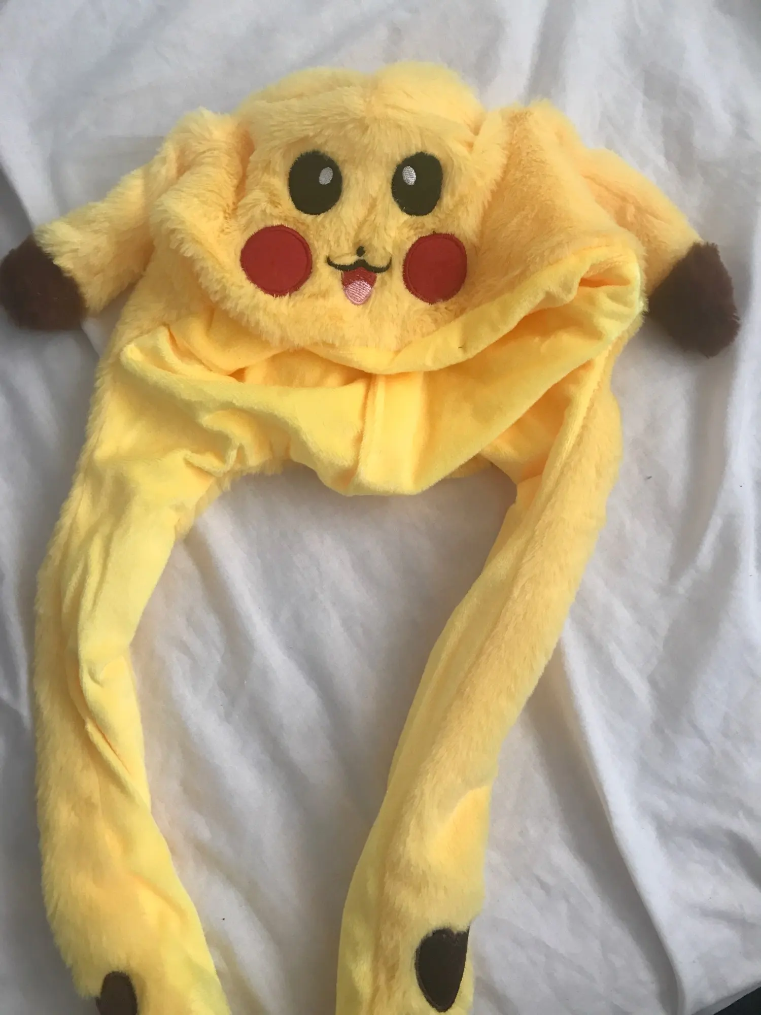Ребенок доволен шляпой pikachu, которая поднимает уши. Это то же качество, которое они продают на рынках за более чем вдвое больше денег.