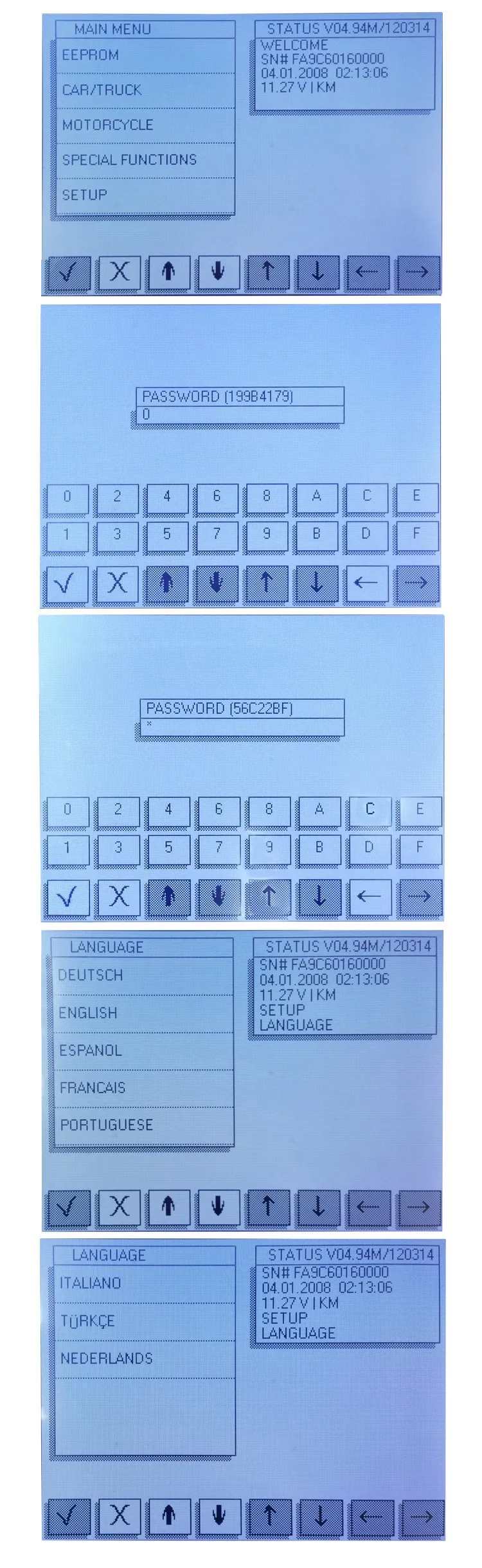 A: пароль Digiprog 3 Power-on-1. После ввода пароля «1» нажмите tick «√» not «X», иначе Digiprog3 замерзнет.