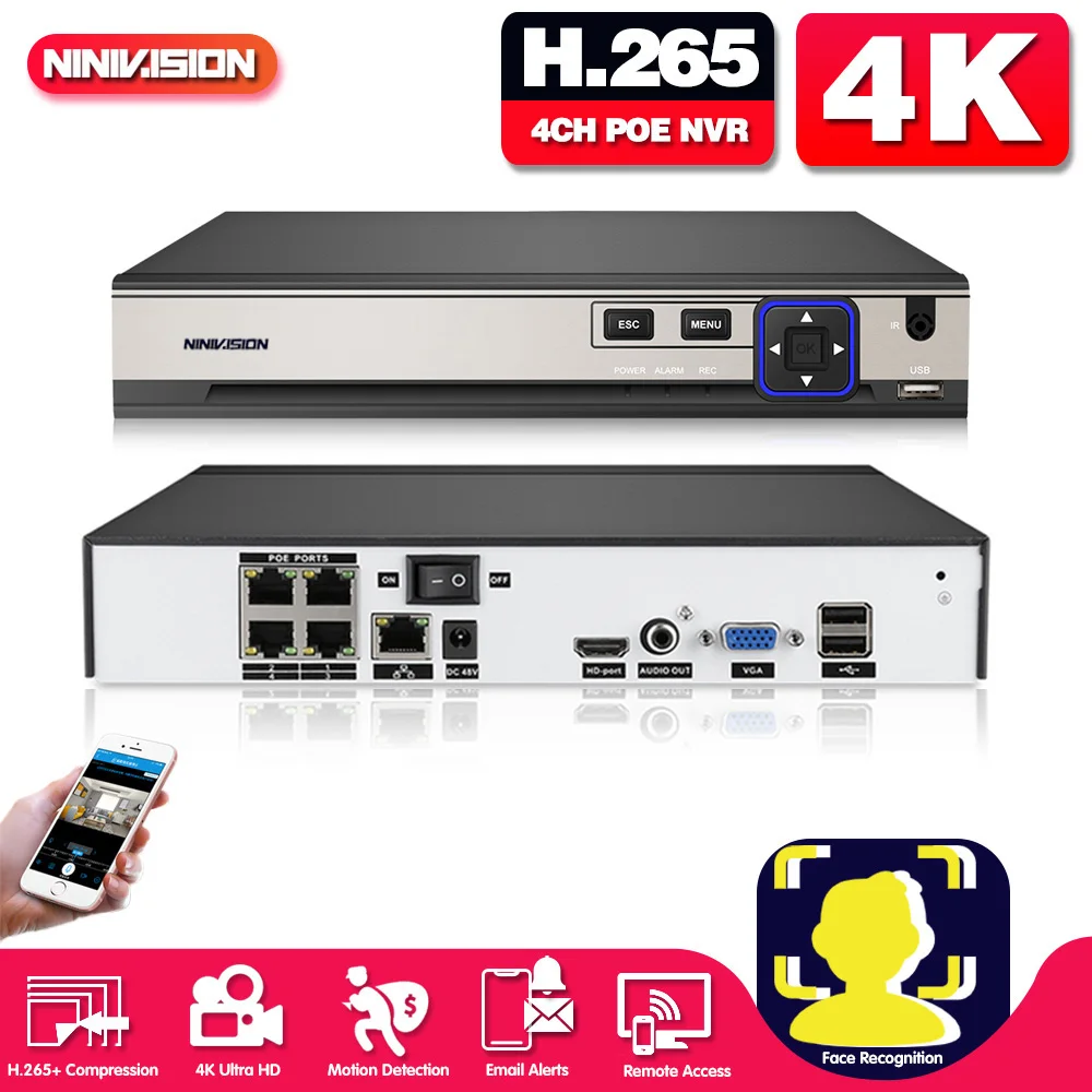 Камера видеонаблюдения H.265 4 канала 8 каналов 4K POE NVR для HD 1080P 4 МП 5 Мп 8 Мп POE IP NVR AI сетевой видеорегистратор с функцией обнаружения лица