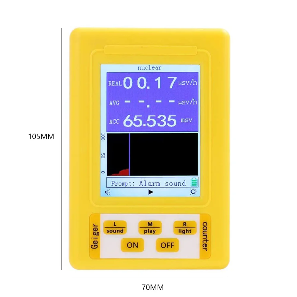 Описание:Большой экран облегчает Считывание данных, и кнопки просты в эксплуатацииКорпус изготовлен из высококачественного АБС-пластика, который обладает высокой термостойкостью и холодным сопротивлением, высокой прочностью и тонкой прочностьюВысокая чувствительность, широкий диапазон измерений, имеет длительный срок службыЭлектромагнитное излучение и атомное излучение могут быть обнаружены. Он может удовлетворить потребности в домашнем обнаружении жизни, обнаружении подстанций, обнаружении башни мобильного сигнала и т. д. он также может быть применен для проверки материала, экологического теста, радиологической защиты, радиофармацевтического скрининга и т. Д.С выключением звука, будильником, кнопкой выбора звука частиц, тестом, значением сброса значения, кнопкой выбора ретеста, подсветка может быть включена или выключенаХарактеристики:Материал: АБС-пластикЦвет: желтыйМодель: BR-9CРазмер экрана: 57x43 ммТест электромагнитного излучения:Диапазон испытаний:Мощность Плотность: 0-99.999μw/c㎡Интенсивность электрического поля: 0-999,99 в/мИнтенсивность магнитного поля: 0-99.999μTТочность теста:Мощность Плотность: 0,001 мкВт/c㎡Напряженность электрического поля: 0,01/мИнтенсивность магнитного поля: 0.001μTЧастотный диапазон:Плотность мощности: 50 МГц-5 ГГцИнтенсивность электрического поля: 20 Гц-100 МГцИнтенсивность магнитного поля: 20 Гц-1 МГцИспытание ядерной радиации:Тип датчика: Тип компенсации энергии для трубки GMОбнаруживаемые типы: для бета, гамма, рентгеновского излученияДиапазон энергии: 20kev ~ 3.0mev ≤ ± 30%(137Cs-)Чувствительность: 80CPM/μsv/(Co-60)Тесты точность: 0,01 ч/чДиапазон в реальном времени: 0-99,99sv SV/чСовокупный диапазон: 0-99.999msvОшибка в реальном времени: ≤ 10%Средняя погрешность: ≤ 3%Батарея: 3xAA 1,5 V Батарея или 3x1,2 V аккумуляторная Батарея (не входит в комплект)Зарядка: USB 5V 2A входВремя зарядки: ≥ 4 часаРазмер: 105x70x30 мм/4.1x2.8x1.2inПримечание:-При преобразовании режима необходимо выключить устройство и повторно войти на страницу выбора.-Возможны небольшие погрешности в размере при ручном измерении.-Отклонение цвета может отличаться из-за различных настроек монитора, пожалуйста, поймите.Упаковочный лист