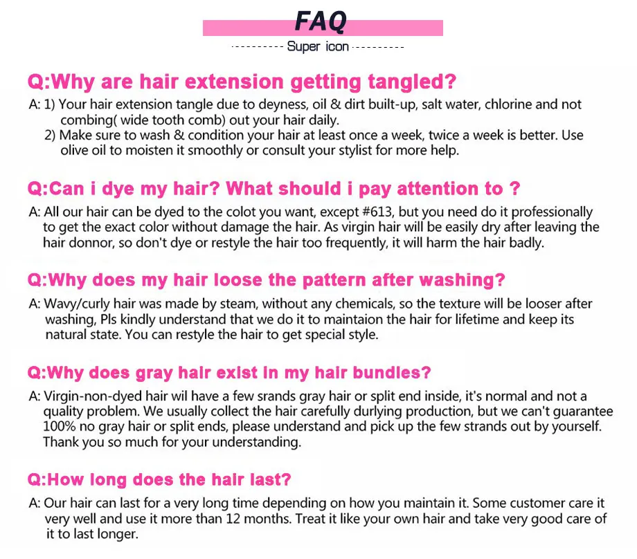 В1: почему накладные волосы запутываются вместе?A1: краска для волос, смазка, грязь, соленая вода, хлор и другие вещества могут легко привести ваш парик к запутыванию. Рекомендуется расчесывать его с помощью широкой зубной расчески каждый день.Обязательно Стирайте и ухаживайте за волосами не реже одного раза в неделю, желательно два раза в неделю. ИспользованиеОливковое масло, чтобы сделать его гладким и влажным, или проконсультируйтесь с вашим дизайнером для получения дополнительной помощи.В2: Могу ли я покрасить волосы? На что я должен обратить внимание?A2: в дополнение к № 613, наши волосы также могут быть окрашены темнее, но вам нужно профессионально окрашивать волосы. Лучше всего сопровождать вашего стилиста волос.Поскольку после ухода из организма человеческие волосы теряют питательные вещества, их легко сушить.Пожалуйста, не окрашивайте волосы по своему желанию, иначе это серьезно повредит волосы.В3: Почему мои волосы ослабляются после стирки?A3: волнистые/вьющиеся волосы сделаны из пара без каких-либо химических веществ, поэтому текстура будет ослаблена после использования.Пожалуйста, поймите нас, мы делаем это, чтобы сохранить волосы в живых дольше.В4: почему серые halos появляются в прядях волос?A4: необработанные волосы будут иметь серые волосы или концы волос. Это в порядке вещей и не является проблемой качества. Мы обычно тщательно собираем волосы во время производственного процесса, но мы не можем гарантировать 100% волос без серых или секущихся кончиков, вы можете выбрать их самостоятельно.Большое спасибо за понимание.В5: Как долго волосы могут длиться?A5: согласно вашему способу обслуживания, наши волосы могут длиться долгое время. Некоторые клиенты хорошо заботятся о своих волосах, и волосы используется для более чем 12 месяцев. Пожалуйста, отнеситесь с этим как с вашими собственными волосами и Позаботьтесь о них, чтобы ваши волосы могли прослужить дольше.Вопрос 6: Что делать, если у меня есть другие вопросы?A6: вы можете связаться с нами в любое время, из-за разницы во времени, мы ответим на ваше сообщение в течение 24 часов, пожалуйста, поймите.