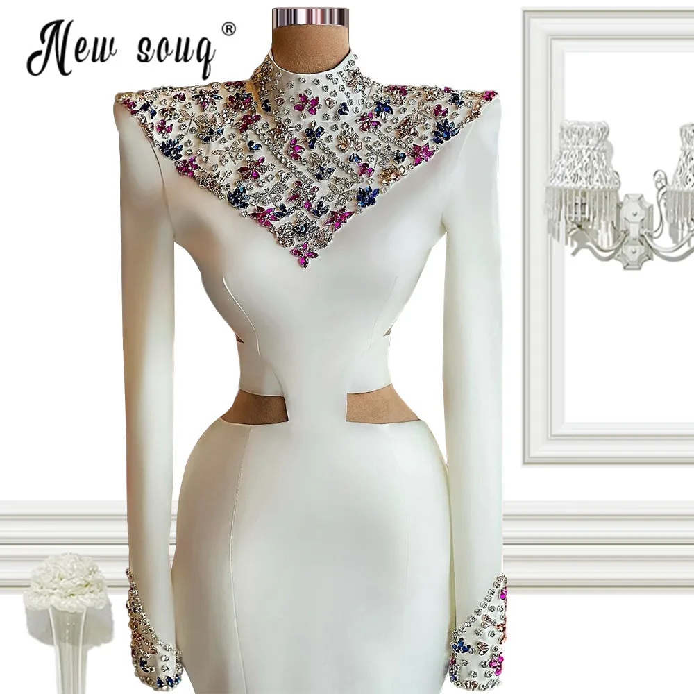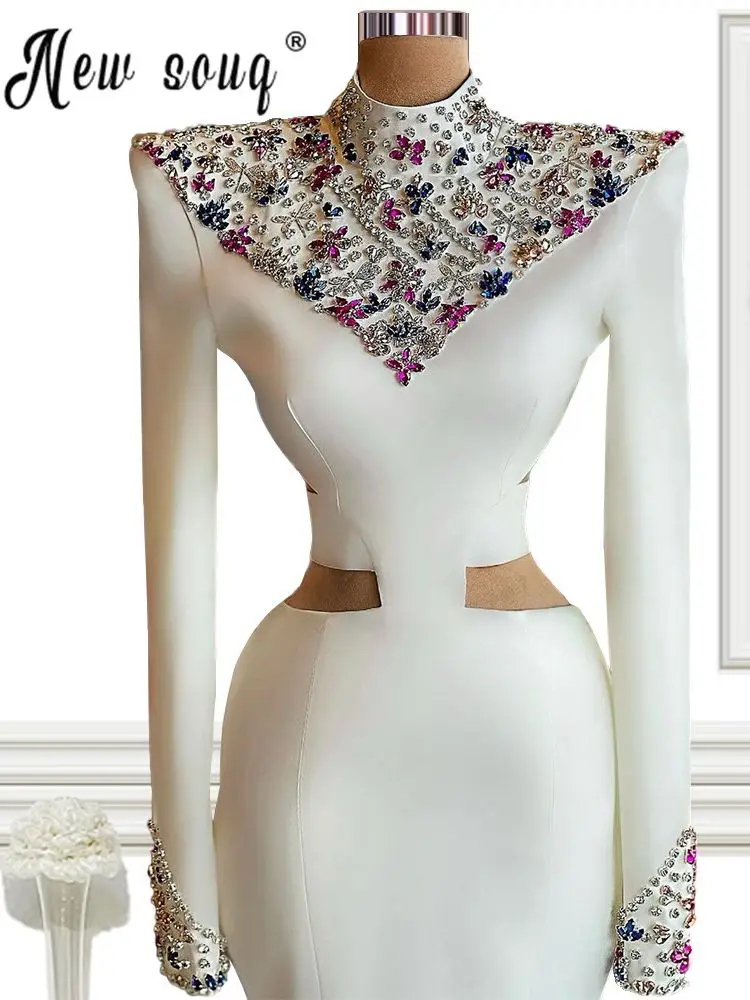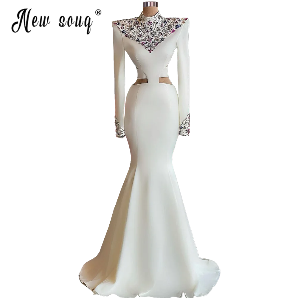 Мусульманское с высоким воротником длинный рукав Блестящий платье для выпускного со стразами белый Африканский русалка длинный халат вечернее платье длиной до пола De Soiree