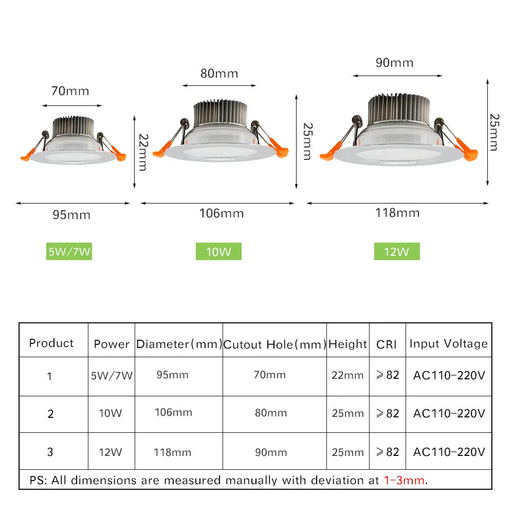 Вход: AC85-265VМатериал корпуса: высококачественный алюминийБыстрое рассеивание тепла.Продолжительная работа.Мощность: 5 Вт 7 Вт 10 Вт 12 ВтСветодиодный светильник: светодиодный SMD чипЛюмены (лм): 100-110 лм/ВтУгол луча: 120 °Индекс цветопередачи: Ra >90Светильник Цвет: холодный белый (6000-6500K)Теплый белый (3000-3500K)Натуральный белый (4000-4500K)