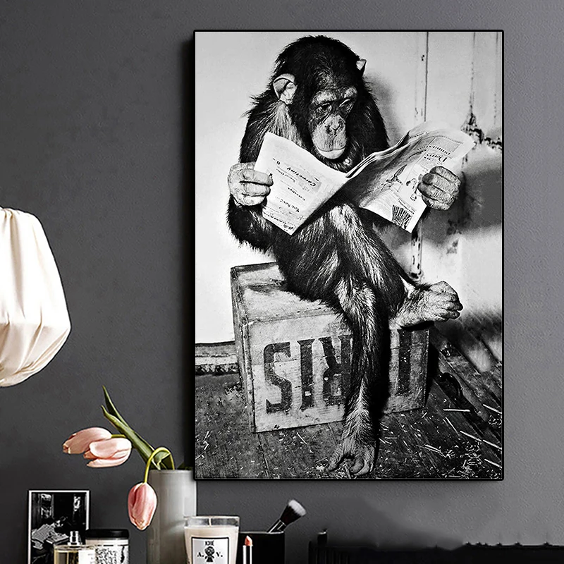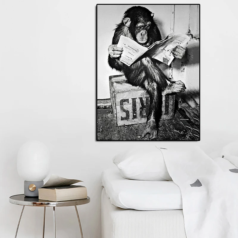 Черно-белая Картина на холсте с изображением обезьяны для чтения