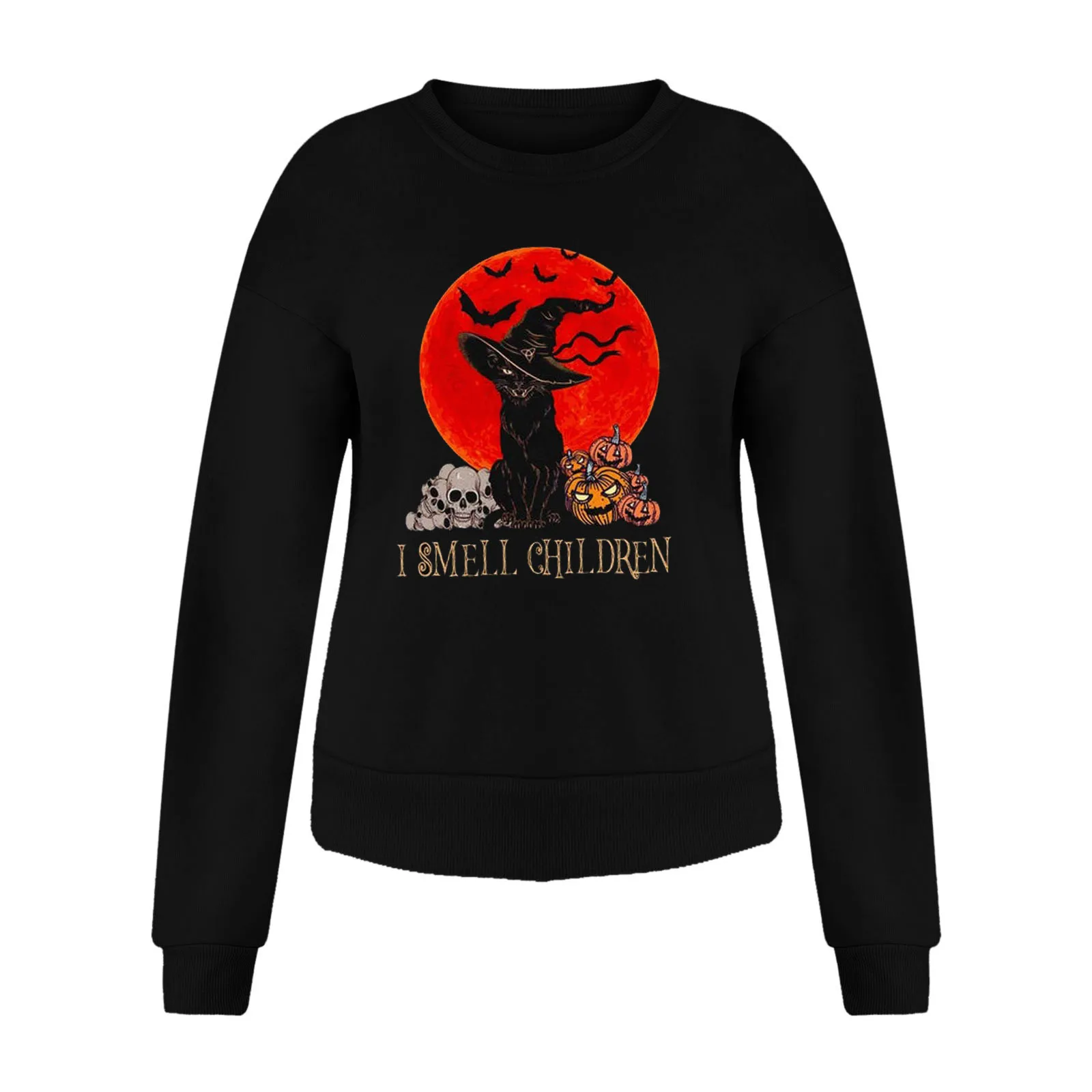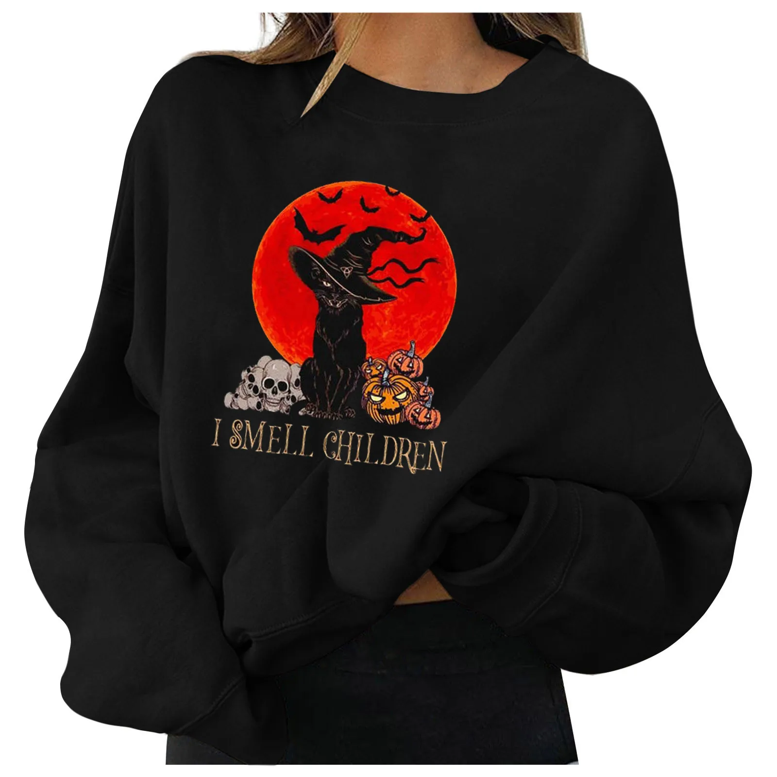 Женские толстовки принт ведьмы с котом, черепом, тыквой, длинным рукавом, пуловер на Хэллоуин, Женский свитшот в западном стиле, повседневный Свободный Топ для девушек