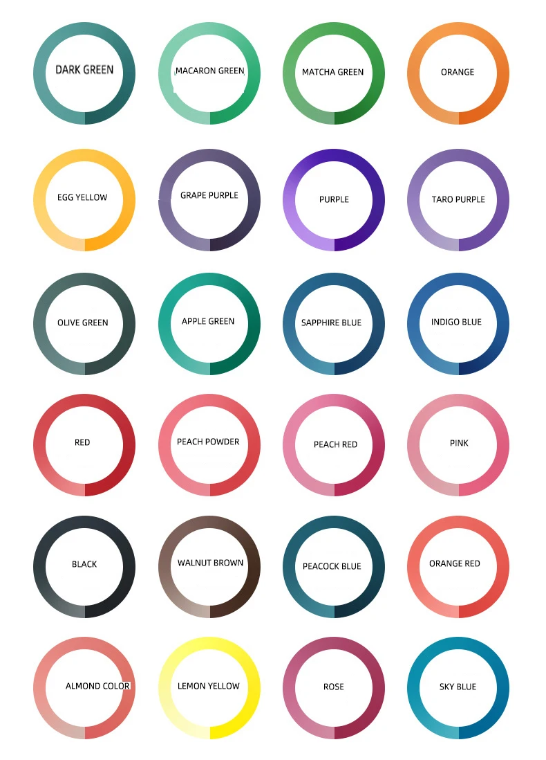 Цвет: зеленый лес, зеленый макарон, зеленый матча, оранжевый, желто-яичный, фиолетовый виноград, фиолетовый, фиолетовый Таро, оливковый зеленый, зеленое яблоко, сапфировый синий, синий Индиго, большой красный, персиковый красный, Персиковый Порошок, розовый, черный, орех коричневый, павлин синий, оранжевый красный, миндаль, Лимонно-желтый, розовый, небесно-голубой