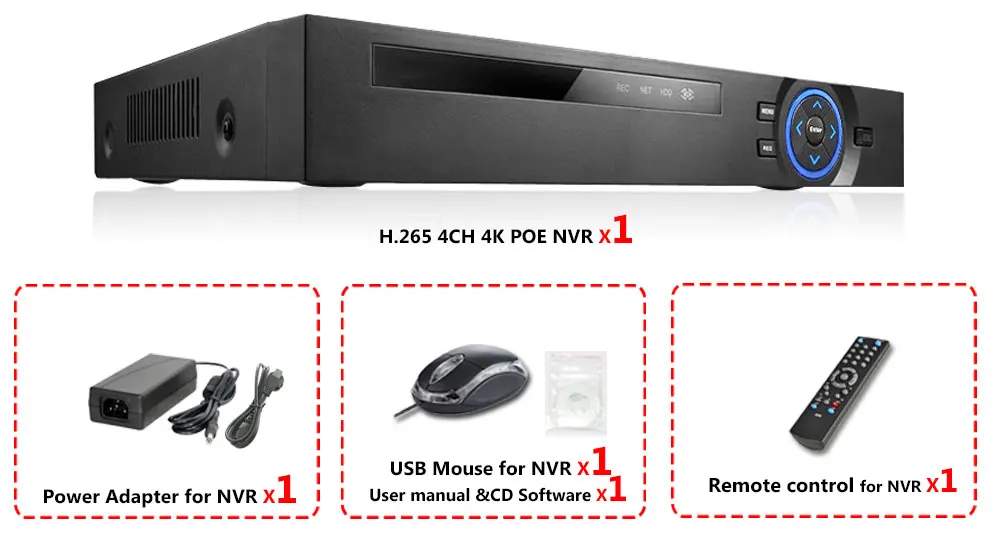1 сетевой видеорегистратор H.265 4CH 4K POE NVR;1 x Блок питания для NVR;1 х USB мышь для NVR;1 компакт-диск программного обеспечения для NVR;1 пульт дистанционного управления для NVR;Жесткий диск в комплект не входит!