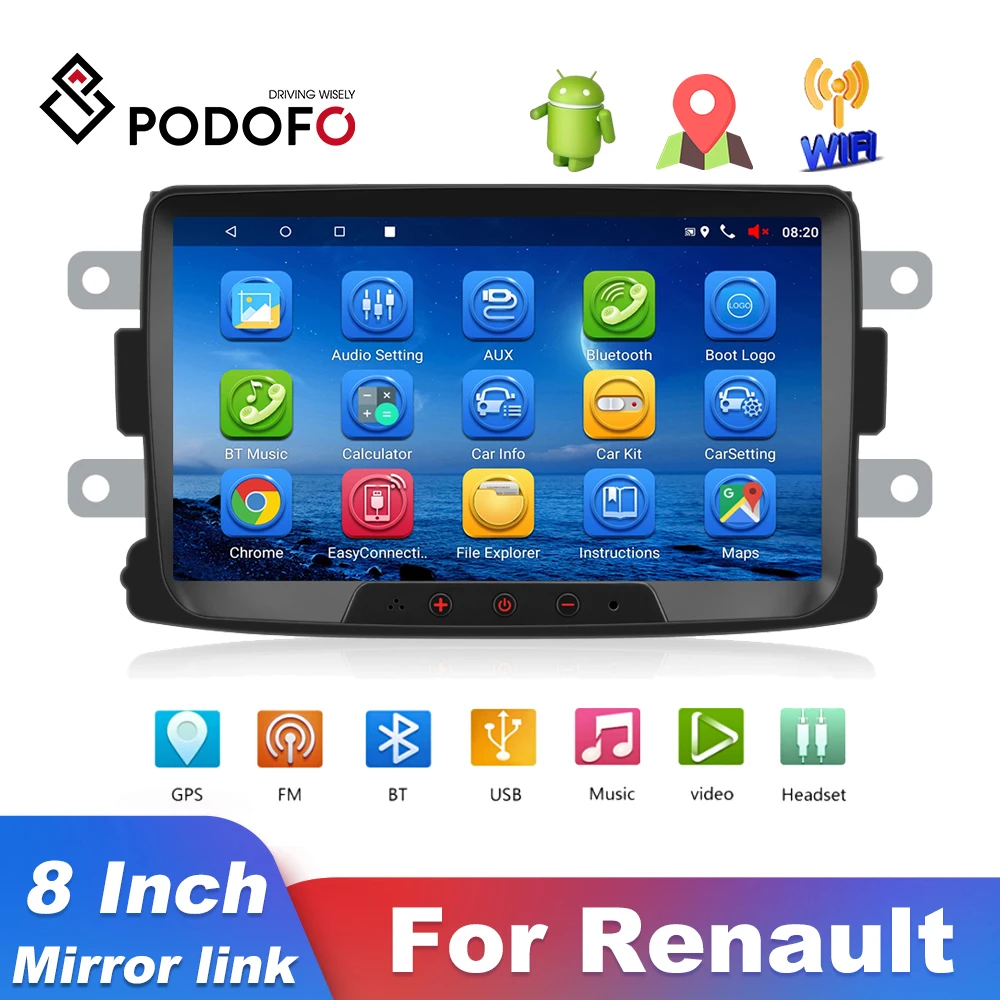 Автомагнитола Podofo, мультимедийный MP5-плеер на Android, с GPS, Wi-Fi, для Renault Sandero Logan II Duster Dacia Dokker, типоразмер 2 Din, 8 дюймов