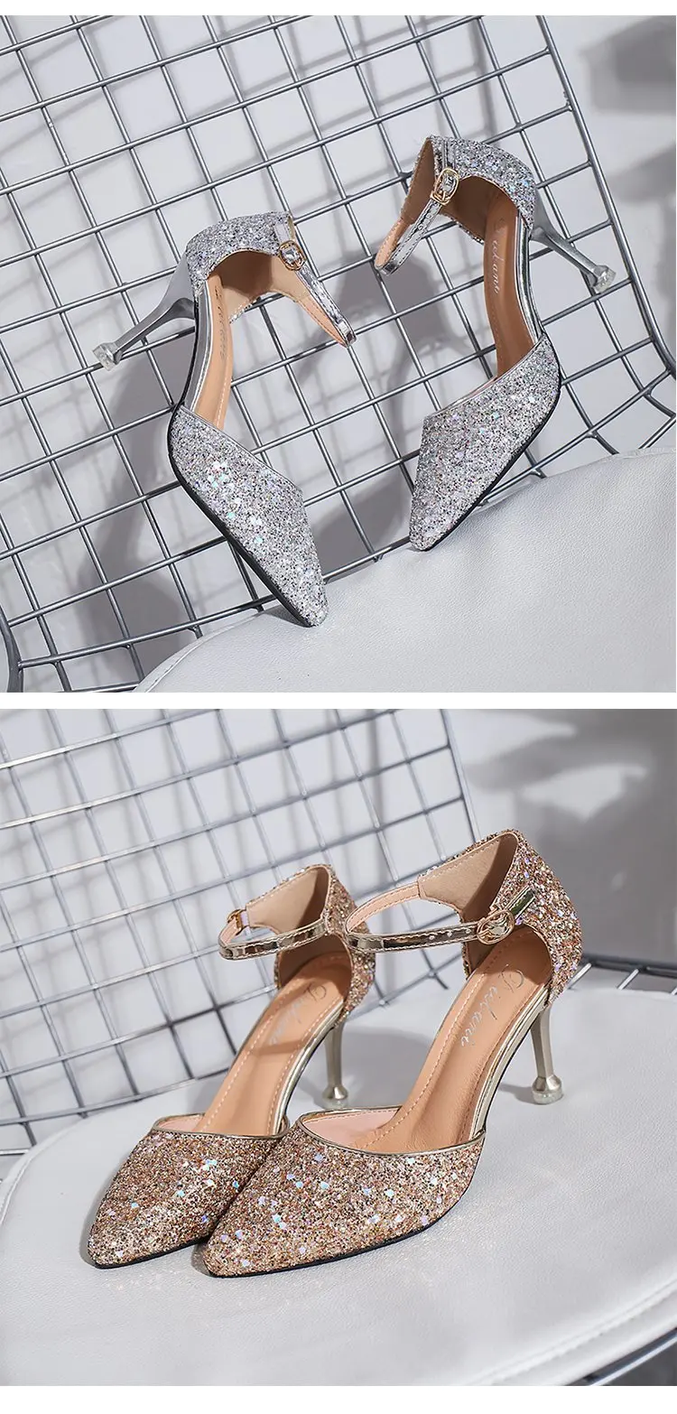 Туфли-лодочки женские Серебристые на высоком каблуке, Свадебная обувь для невесты, вечерние туфли-лодочки с блестками, с острым носком, на шпильке, золотистые
