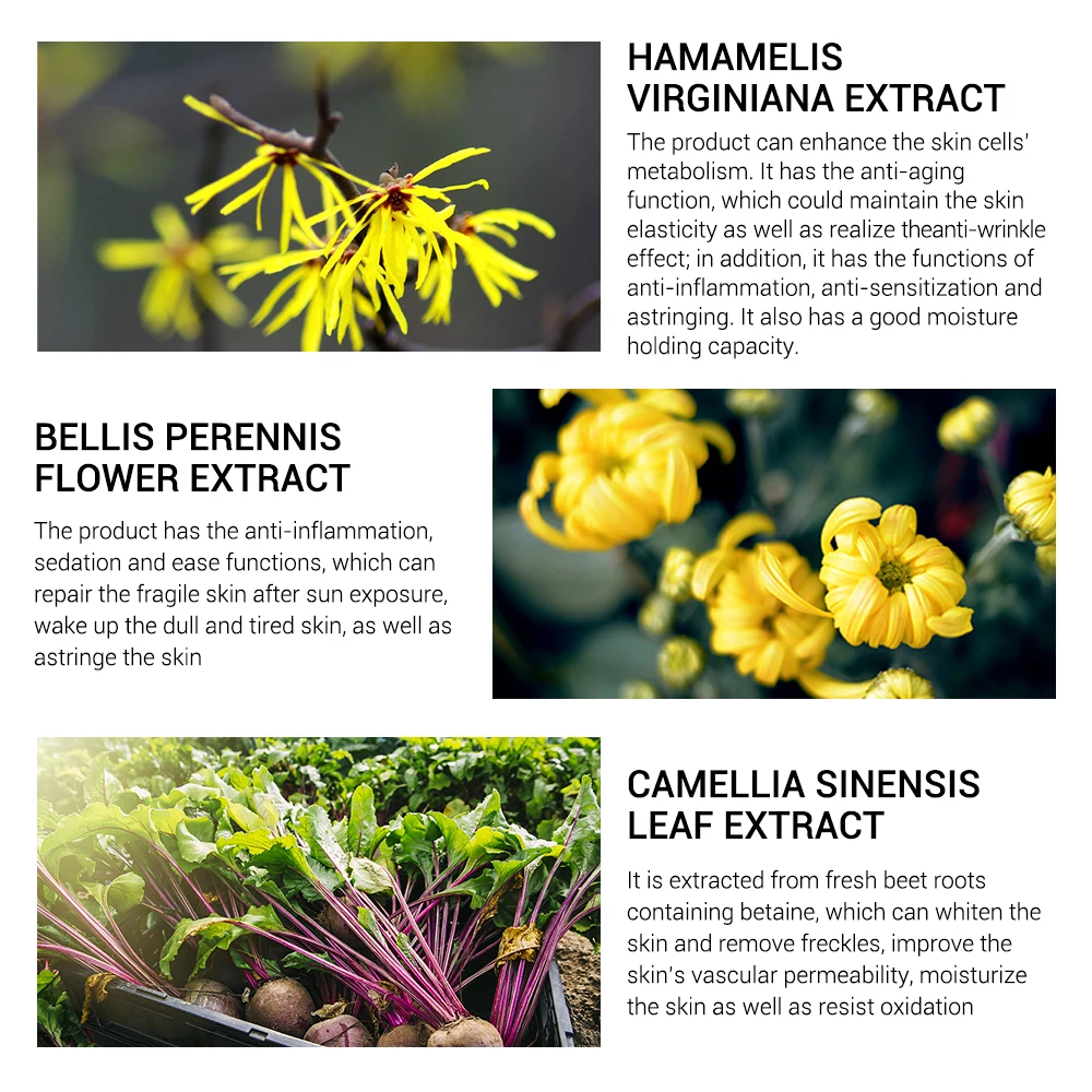 Продукт имеет анти-воспаление, седацию и облегчение функций, которые могут восстанавливать хрупкую кожу после солнечного воздействия, пробуждать тусклую и усталую кожу, а также портить кожу