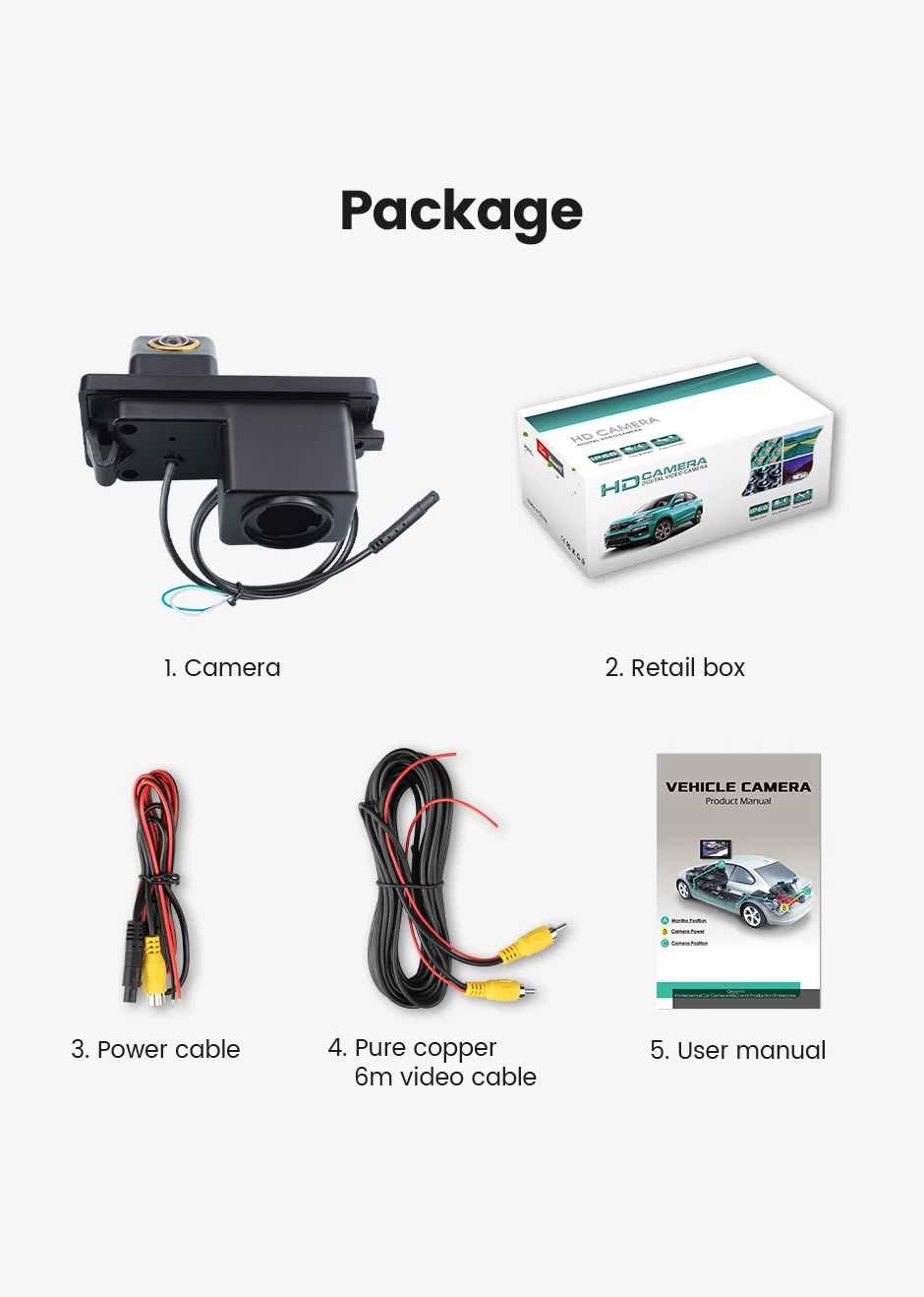 1. Камера заднего вида2. Розничная коробка3. Кабель питания4. Чистый медный 6 м видео кабель5. Руководство пользователя