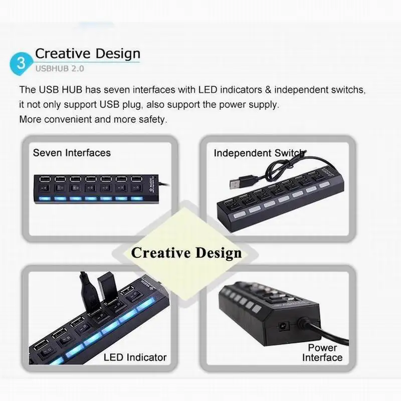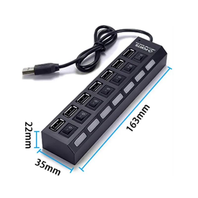 1. 100% новый и высокое качество 2. Устройство USB Hot Plug & Play 3. Полностью совместим с USB версии 2,0 4. Синий светодиодный источник питания 5. С независимым переключателем, нет необходимости подключать или деактивировать отдельные порты 6. Разработанный с 7-портовый, эта компактная USB2.0 высокоскоростной концентратор достаточно мал для поездок, и кабеля достаточно, чтобы удовлетворить ваши потребности в подключении