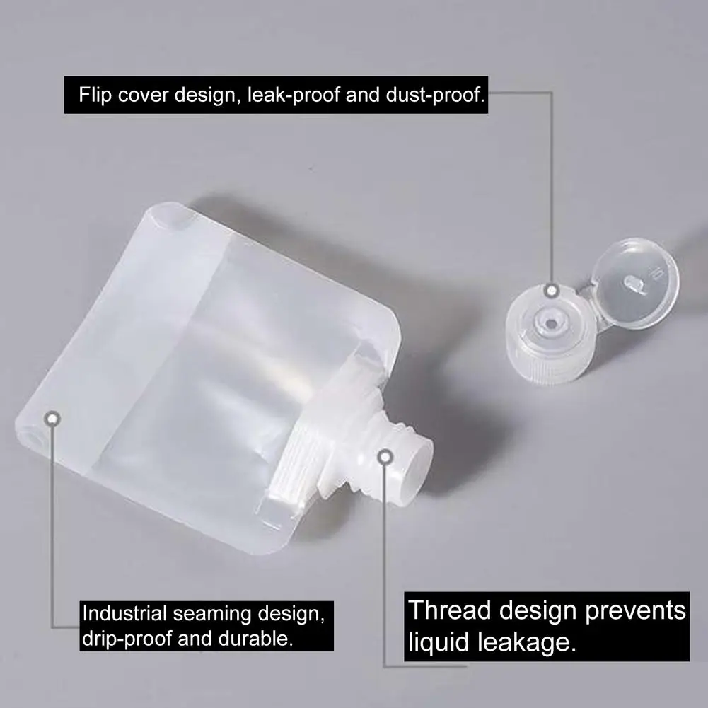 Bullet Points:1、Package Included: You will receive 10 refillable empty pouches; the quantity is sufficient to meet your daily needs for storing liquid items.2、3 Different Capacities: These toiletry pouches have 3 capacities, including 30 ml, 50 ml and 100 ml. You can choose the capacity according to your needs.3、Premium Materials: Made from high-quality materials, theses pouches are sturdy and durable, washable and reusable, leakproof and waterproof, not easy to break.4、Multiple Uses: These travel toiletry pouches can be used to store body lotions, shampoos, powder, lotions, hand creams, shower gels, sunscreens, etc. They just provide you with ample storage space.5、Practical Design: Each pouch has a flip top, which can be tightened with a few twists to prevent leakage. Perfect for vacations and business trips, cute and practical.Specifications: Material: PET+PECapacity: 30/50/100mlNozzle opening width: about 16mm/0.63inchSmall hole of the outer flip cover: about 2.5mm/0.1inchWeight: about 75g/90g/102gPacking List:10*Toiletry PouchOnly the above packaging content, other products are not included.Notes: Due to the lighting effects and shooting angles, the color of the item and that shown in the picture might have a nuance.