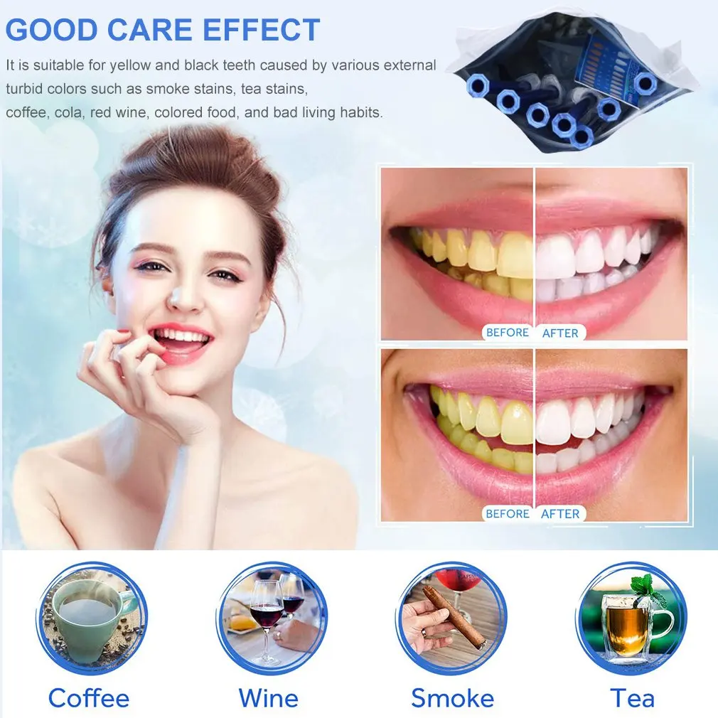 1. Хороший эффект ухода: подходит для желтых и черных зубов, вызванных различными внешними неуродливыми цветами, такими как пятна дыма, пятна чая, кофе, кола, красное вино, цветная еда, И плохие привычки жизни.