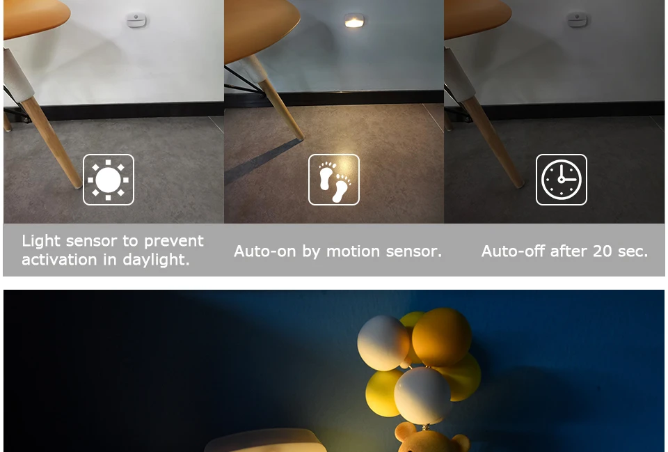 Хороший ночник, стоит в розетки 20 см от пола, реагирует на движении хорошо, срабатывает только в темноте, не как у некоторых тень попала чуть и всё, в общем збс работает.