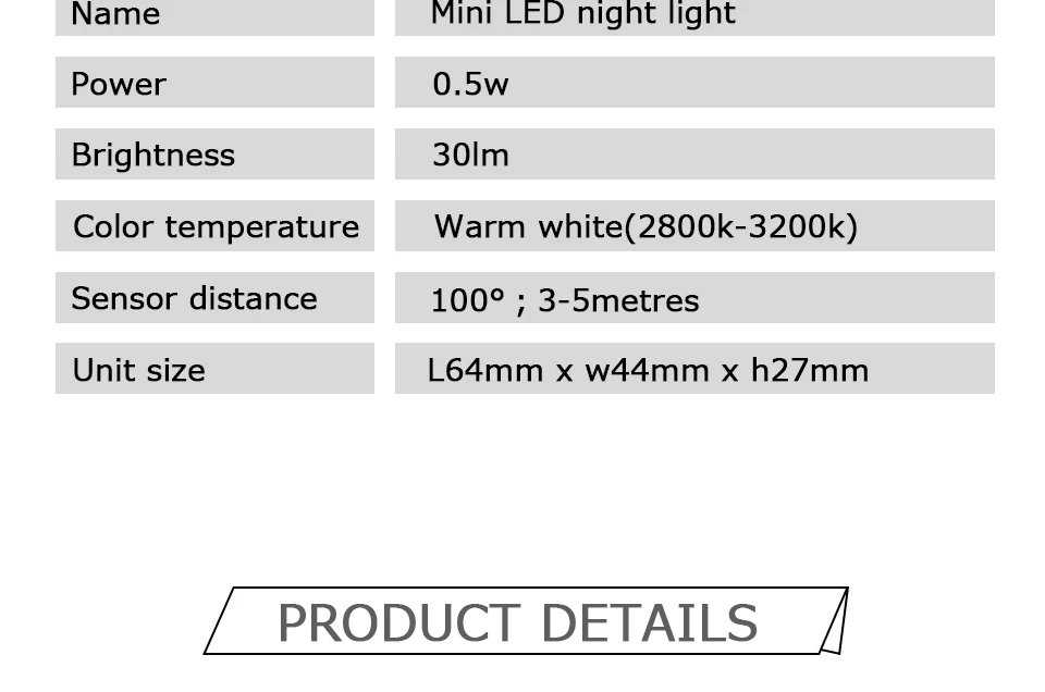 Светильник доставили быстро,на вид не большой, светит не очень ярко но на то он и ночник ,датчик движения срабатывает, и ещё присутствует кнопка яркости,в целом доволен.