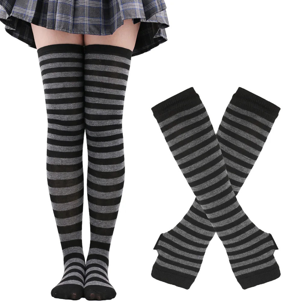 Женские перчатки в полоску, носки, теплые, забавные, для косплея, Гольфы выше колена, готические, милые, сексуальные, до бедра