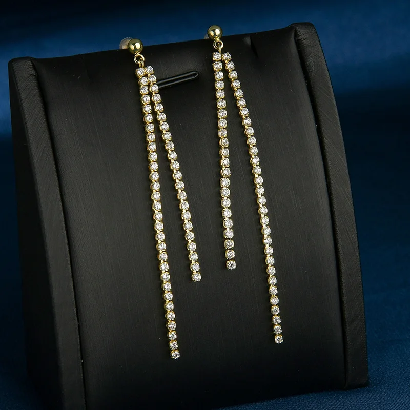 Простые темпераментные циркониевые золотые длинные висячие серьги с...