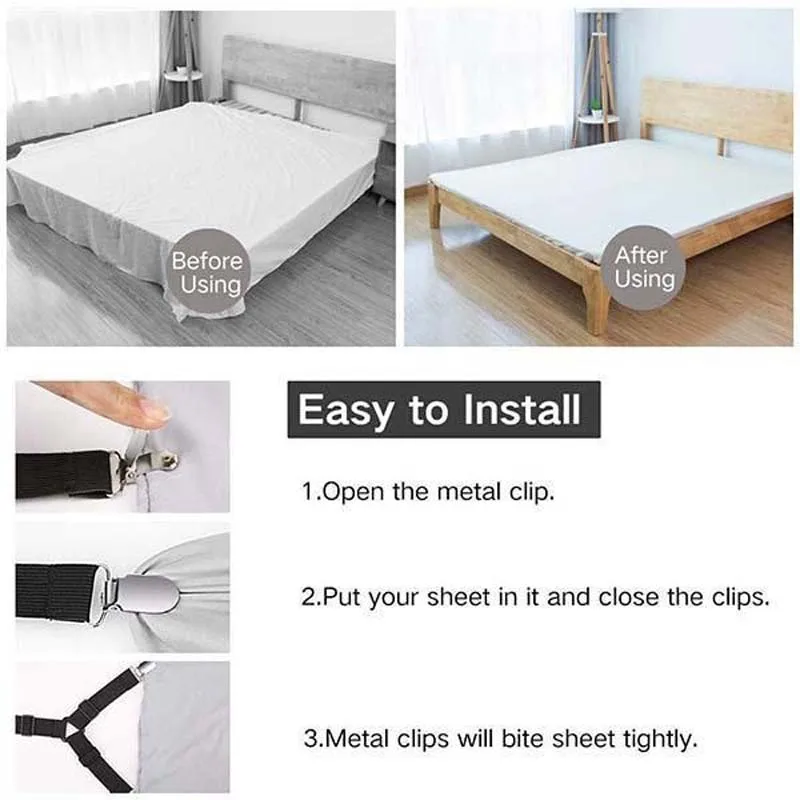 Широкая совместимость:Наш держатель для простыни подходит для простыни и плоского листа; Этот универсальный захват для простыней работает со всеми типами постельного белья и имеет прочную конструкцию этих ремней, ваша простыня будет оставаться на месте в течение длительного времени, и ваша кровать всегда будет выглядеть отлично.