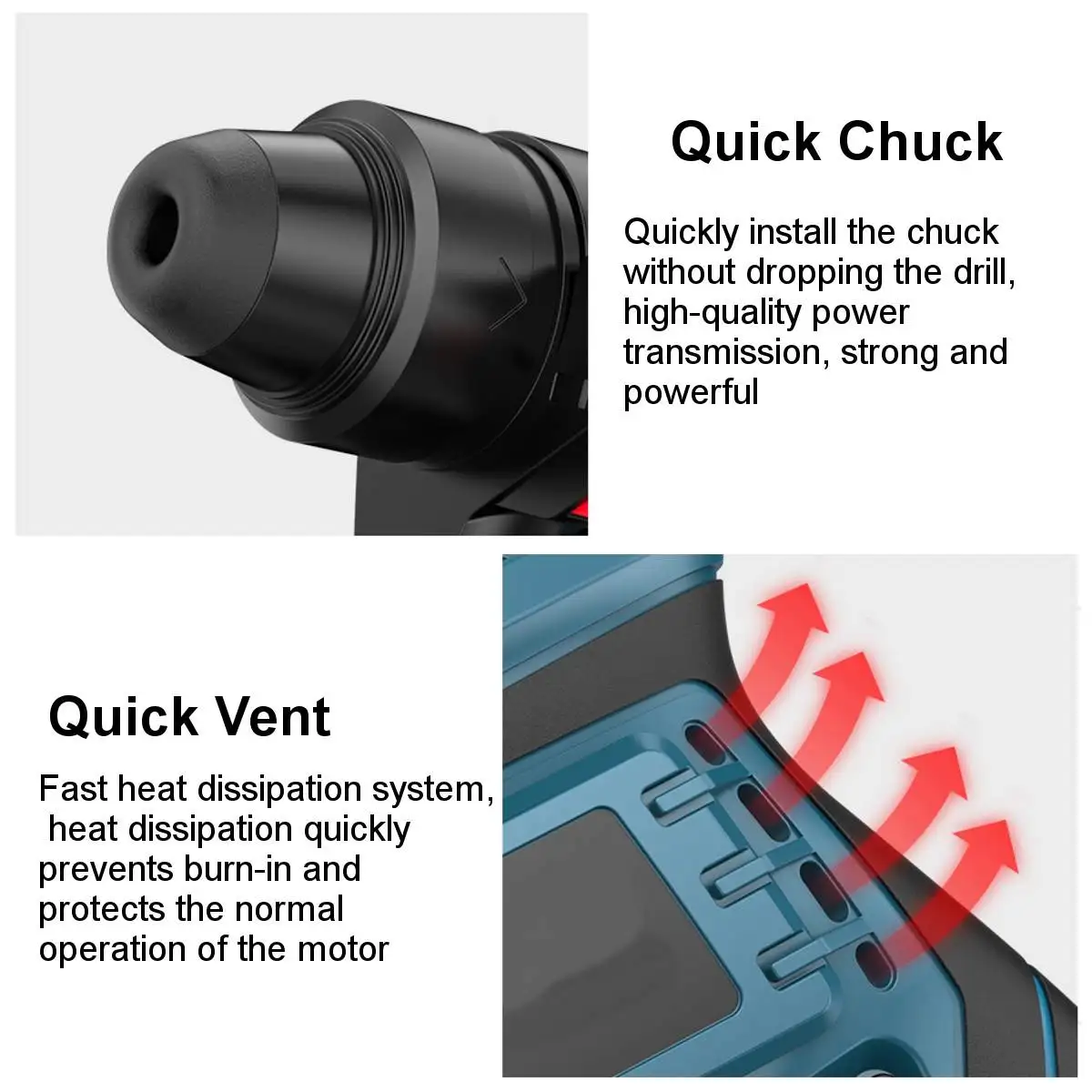 -Регулируемые режимы: 4 режима: режим плоского сверла, режим молотка, режим лопаты, режим калибровки